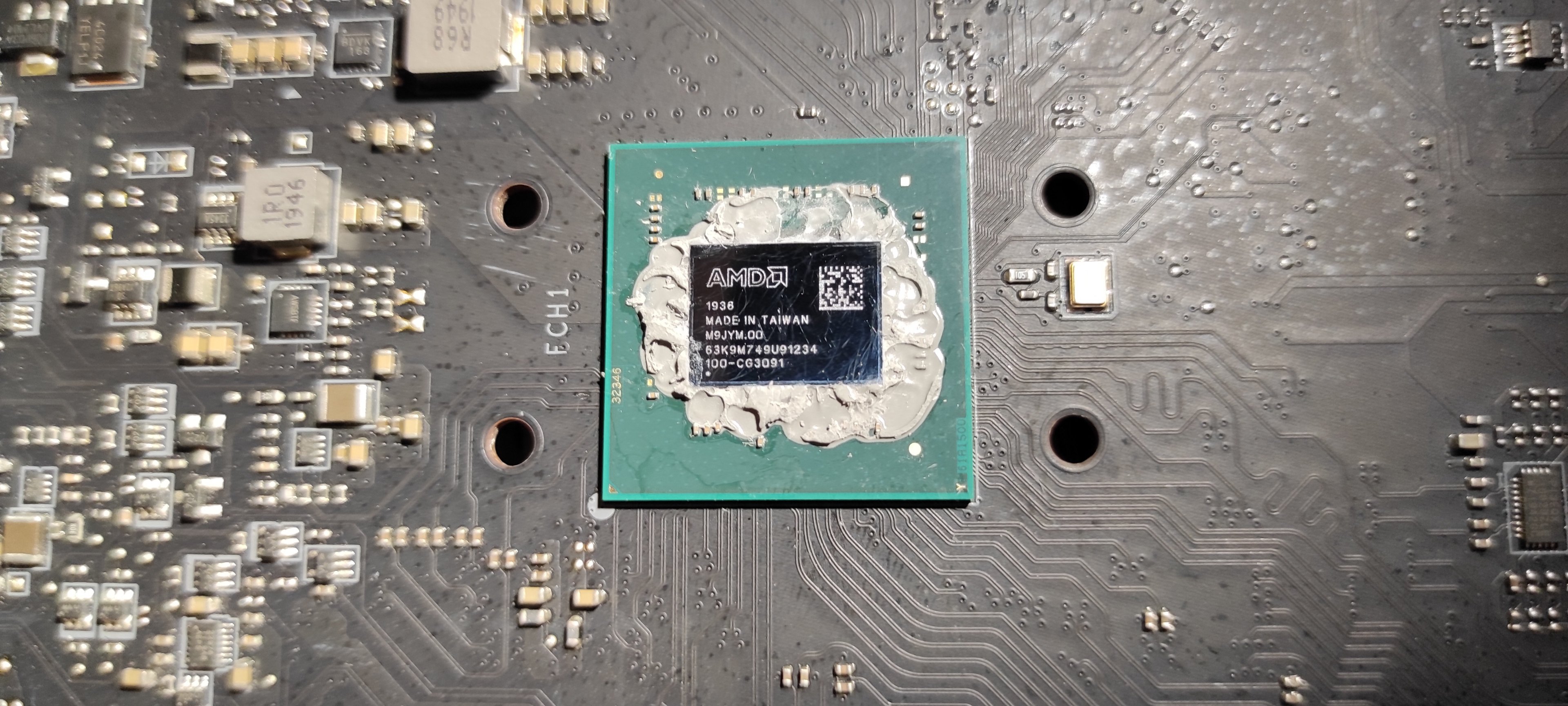 Hatte nach dem Ausbau des Mainboards (Der Kühler ist von hinten verschraubt), schon Angst das ganze mit dem Kühler abzureissen. War alles so festgebacken, mit etwas heißer Fönluft konnte ich den Kühler aber letztendlich vorsichtig ablösen. Darunter ein Bild des grauens 😁.
