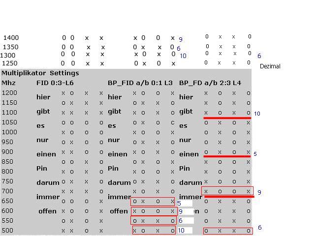 habe sämtliche dipstellungen getestet, starten tut er erst ab 550 mhz ( multi 5.5) und dann bis 1300 ( multi 12.5 =13).