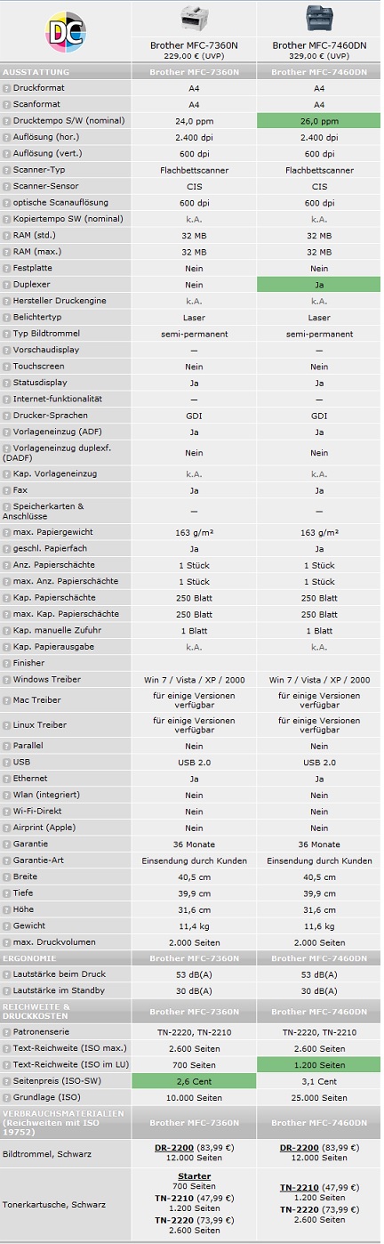 Nach Popularitätsgesichtspunkten auf den großen Preisvergleichsseiten kommen der MFC-7360N und der MFC-7460DN in die engere Wahl. Das DN-Modell kostet ca. 50 EUR mehr und bietet dafür einen Printserver und eine Duplexeinheit.