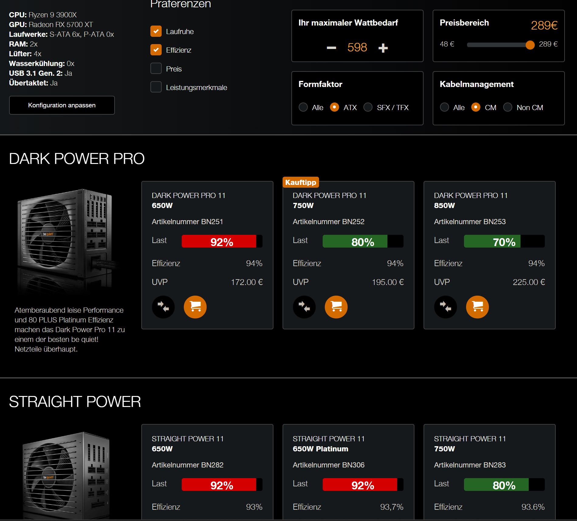 Edit 2: Zum Netzteil: Es ist natĂŒrlich im Interesse von beQuiet möglichst groĂe und teure Netzteile zu verkaufen. Meiner Erfahrung nach ist die Empfehlung beim beQuiet Netzteilrechner fĂŒr das System stets etwas ĂŒberdimensioniert. Wenn du komplett auf der sicheren Seite sein willst fĂŒr möglichen Overclock etc. dann kannst du natĂŒrlich auch die 750W PSU verbauen.