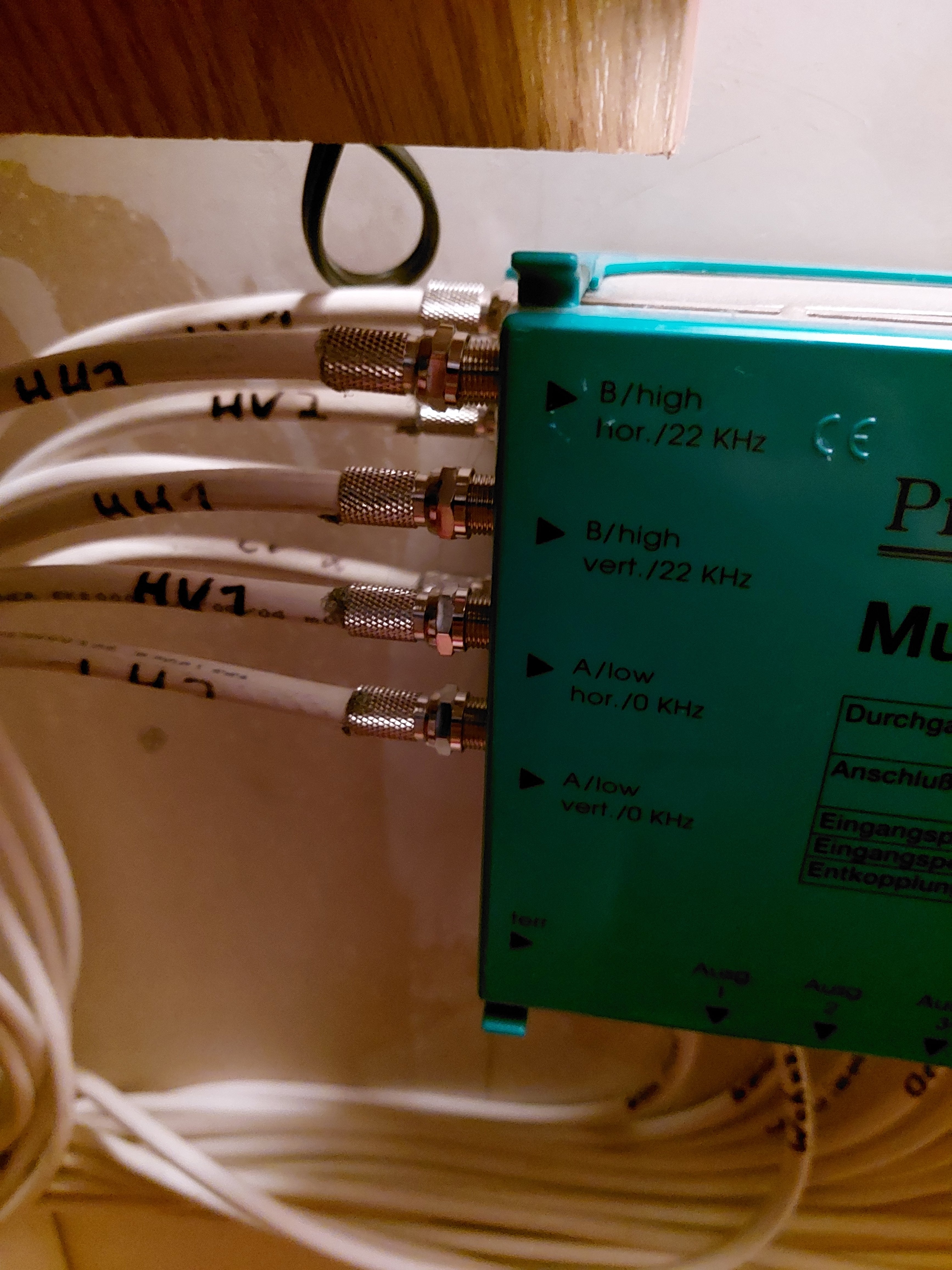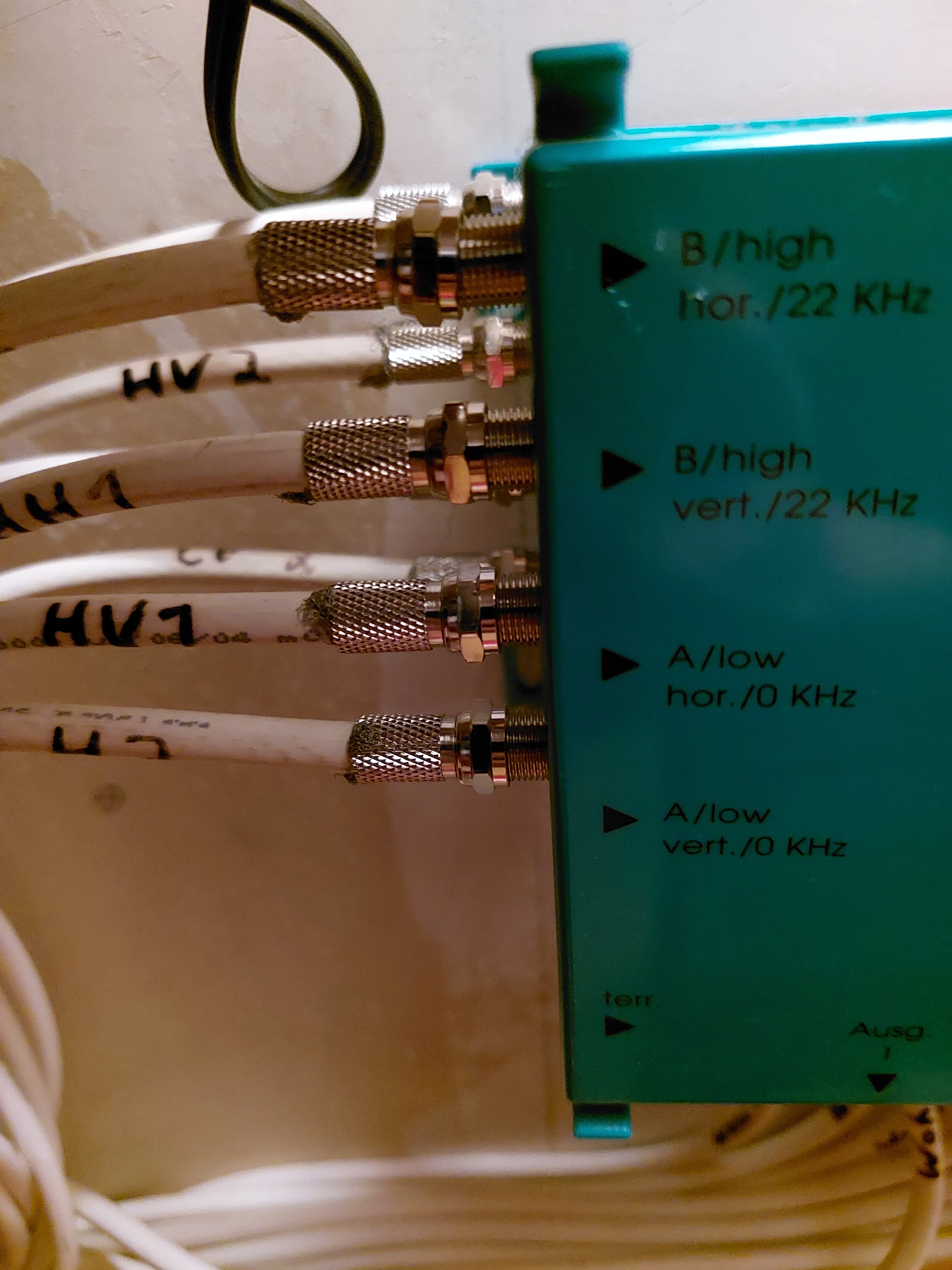Dann kam mir die Idee: Hey, warum nicht direkt die 100€ in einen neuen/besseren Multischalter investieren? Aktuell sind 14 Antennenkabel an die Multischalter angeschlossen (die unteren Kabel, siehe Bilder) und wenn ich das richtig sehe kommen weitere 8 von der Satellitenschüssel(?), welche alle mit "LV, HV, HH, LH" und so weiter beschriftet sind (links, siehe Bilder). Hat jemand eine Ahnung wofür das steht bzw. ob die tatsächlich alle von der Schüssel kommen?
