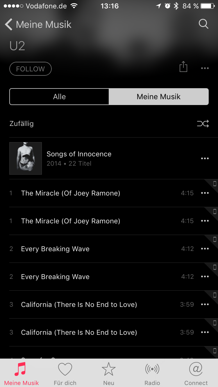 Früher waren alle Titel aufgelistet und es gab einen Button für Shuffe. Seit dem Update zu Apple Music werden aber ab einer gewissen Menge nur noch die Albennamen unter einem Interpreten gezeigt und ich sehe keinen Button für "Alle Titel abspielen" (siehe Screenshot). Gibt es so einen Button oder wurde die Funktion einfach entfernt? Wahrscheinlich bin ich nur zu doof, ihn zu finden.
