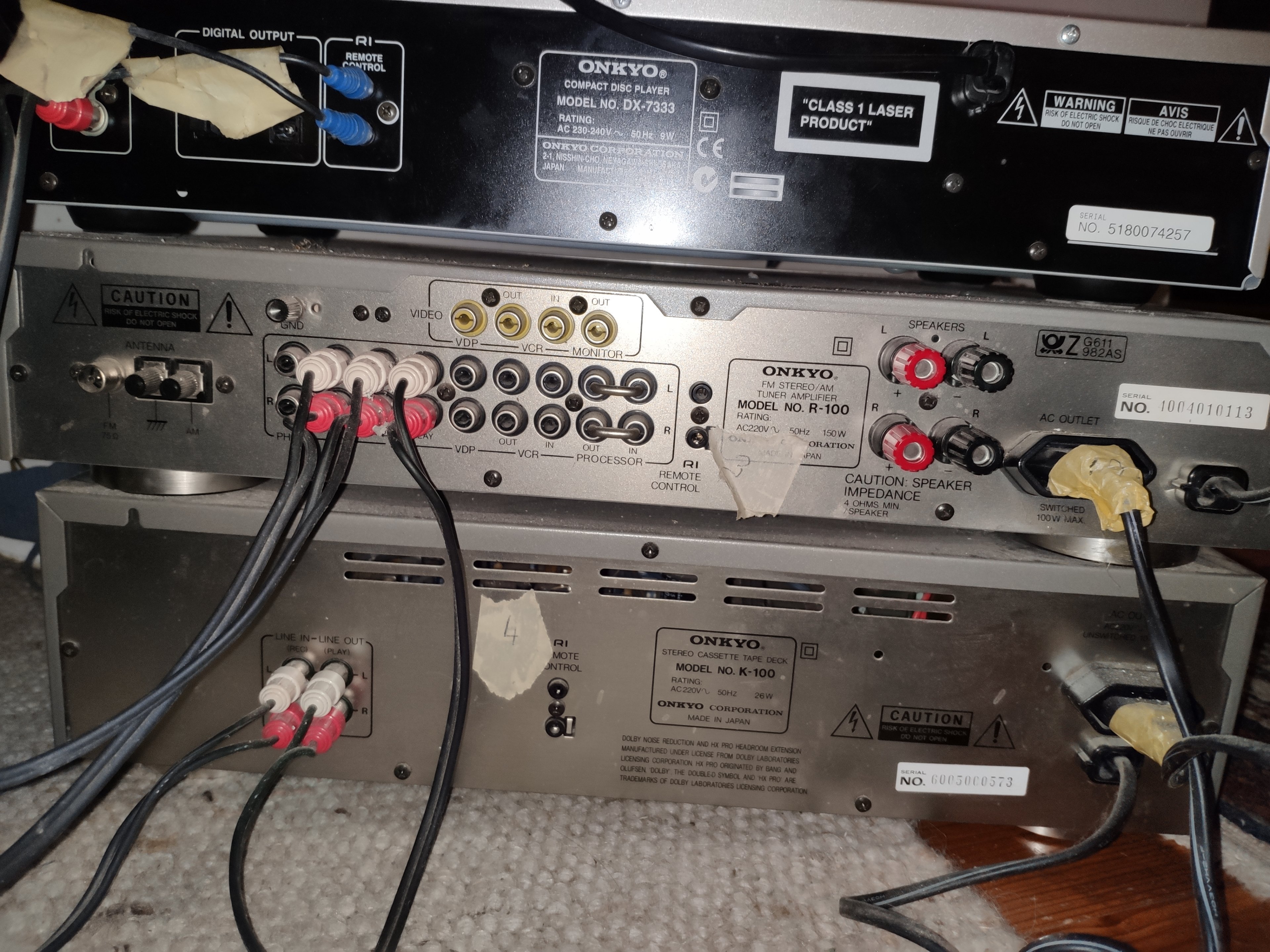 @Ltcrusher Hallo, danke für deine schnelle Antwort. Ich hab mal ein Foto von der Rückseite gemacht. Das mittlere Gerät ist das vorhin erwähnte Onkyo R-100. Oben und Unten sind CD- und Kasettenspieler. Da steht auch "Tuner Amplifier" deswegen dachte ich, dass das auch der Verstärker ist.
