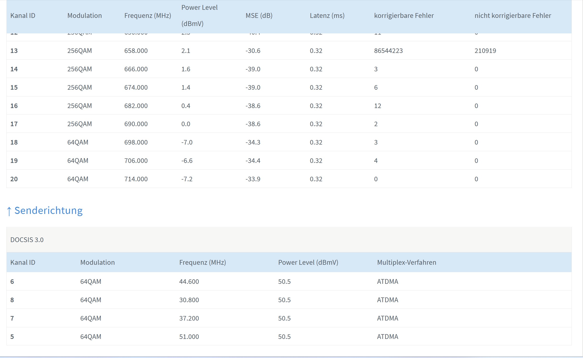 Woran siehst du das? Vodafone bietet nur 4 Upstream Kanäle bei EuroDOCSIS 3.0 und DOCSIS 3.1 beherrscht die 6490 nicht. Bei Unitymedia wäre das Powerlevel um 0,5 zu hoch, bei Vodafone wäre es laut Liste noch in der Toleranz. Und die Modulation ist mit 64QAM im Soll.cartridge_case schrieb:Dein Upload ist ja auch viel zu gering und dein Download auch etwas zu klein.