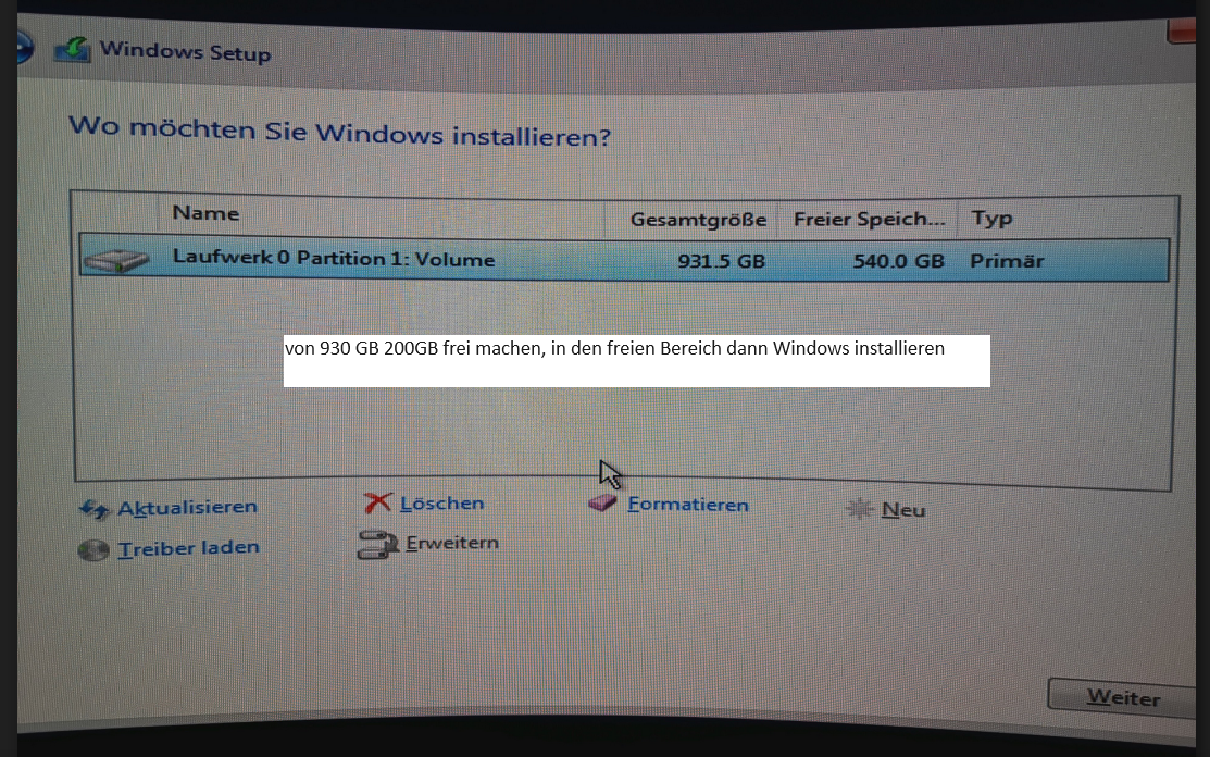 Die 540 GB die noch frei sind verkleinern, sodass 200 GB freiwerden, dann Windows installieren.
