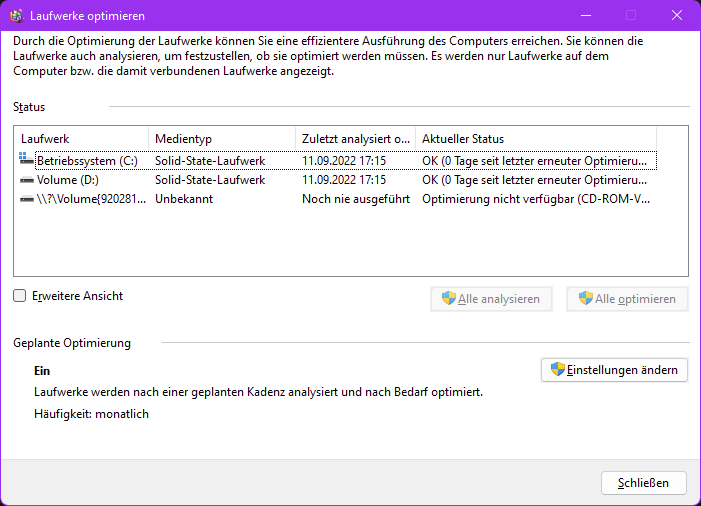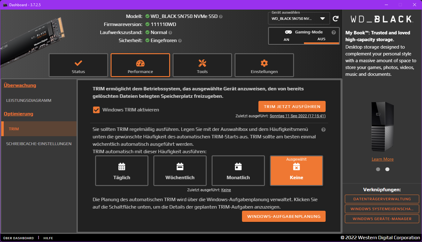 Wird Trim über das Western Digital Dashboard ausgeführt, aktualisiert sich auch die Angabe im Dialog "Laufwerke optimireen" - Zuletzt ausgeführt:Sonntag 11 Sep 2022 (17:15:41).