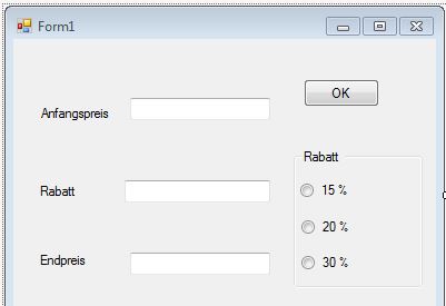 leider hab ich keine Ahnung was genau dein Problem ist. Hilfreich wäre der komplette Source-Code, der ja nicht wirklich umfangreich sein dürfte. Rein aus der Sicht des Benutzers würde ich die Radioboxen nur als Gui-Hilfsmittel nutzen um den Zahlenwert in der Textbox zu ersetzen. Das geht mit sogenannten Events. Bei dem Klick auf den Button "OK" kannst du dann einfach die Werte deiner Textboxen in deine "ausgekoppelte" Funktion "berechne Rabatt" geben und ein dir einen den Rückgabewert in die Textbox "Endpreis" schreiben.