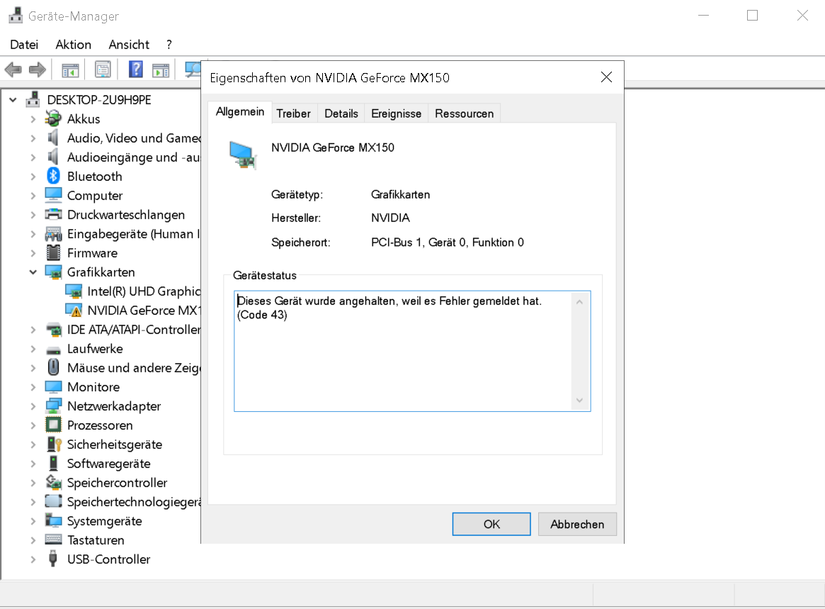 Soweit sogut will sich nur die mx150 nicht installieren lassen. Mit ein 425 treiber kommt Error 43 und der aktuelle treiber fuehrt zu ein BSOD mit No Page memoey error.