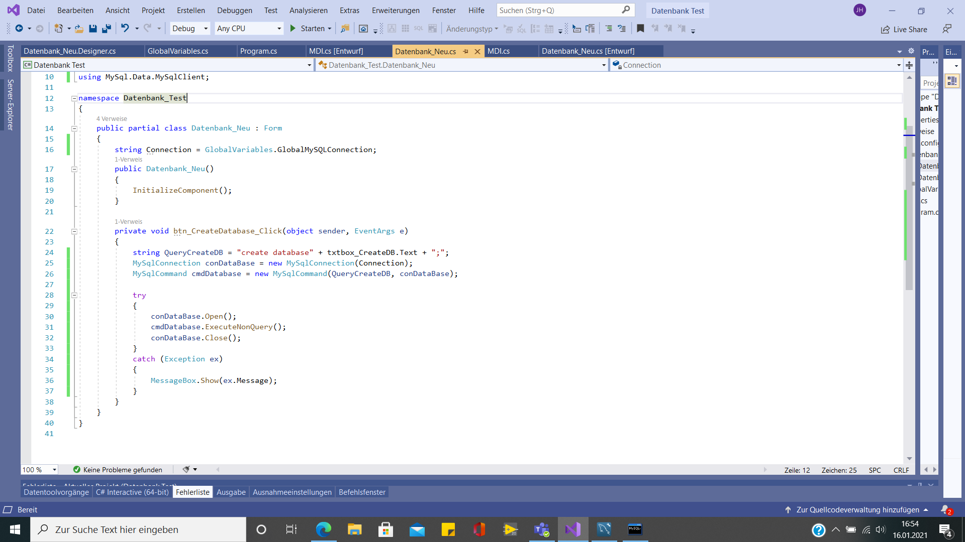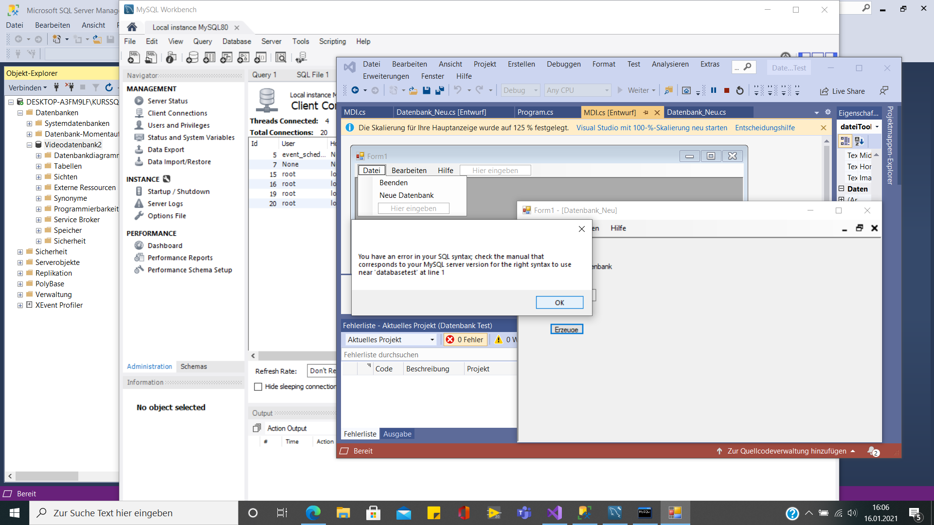 Ich habe nun einen Breakpoint gesetzt bei "create database" gesetzt. Wenn ich nun auf Starten klicke, kommt keine Fehlermeldung mehr. Aber warum ist das so?