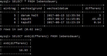 Derzeit habe ich es so implementiert, dass die C# Anwendung beim Eintragen in die Datenbank die zeitliche Differenz vom letzten DATETIME Wert und der aktuellen Systemzeit in Industriestunden errechnet und diesen in eine weitere Spalte der Tabelle einträgt. So kann ich in einer folgenden MySQL-Abfrage über den AVG-Befehl die durchschnittliche Lebensdauer des Teiles aus der Spalte ermitteln.