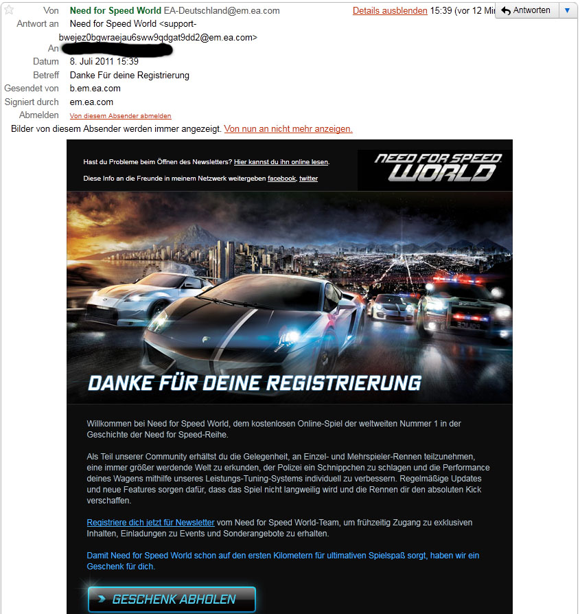 Ja, ich hab auf meinem EA Konto schon FIFA 11, Battlefield Heroes, Bad Company 2 und alles. Ich melde mich aber nur bei den Seiten/Spielen an, auf/in denen ich dann auch aktiv bin/spiele. Deshalb möchte ich wissen, ob ich wirklich bei diesem scheiß NFS World angemeldet wurde. -_-
