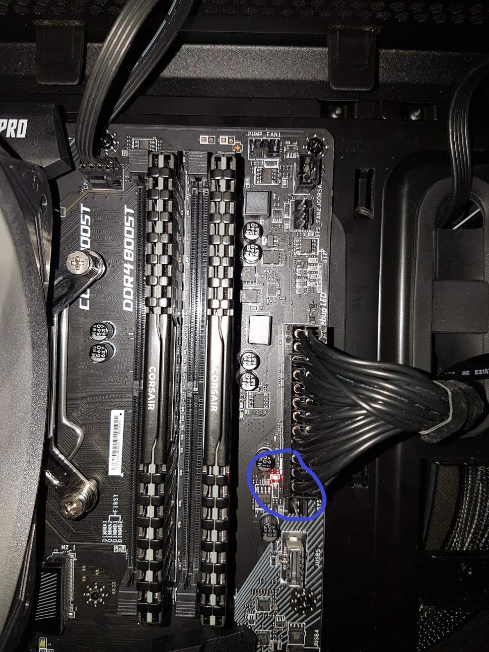 Nein, die EZ Debug LEDs sind es nicht. Die befinden sich lt. Handbuch oberhalb des ATX-Stromsteckers. Die LED leuchtetet in meinem Fall unterhalb des ATX-Stromsteckers - vgl. Foto (blauer Kreis).
