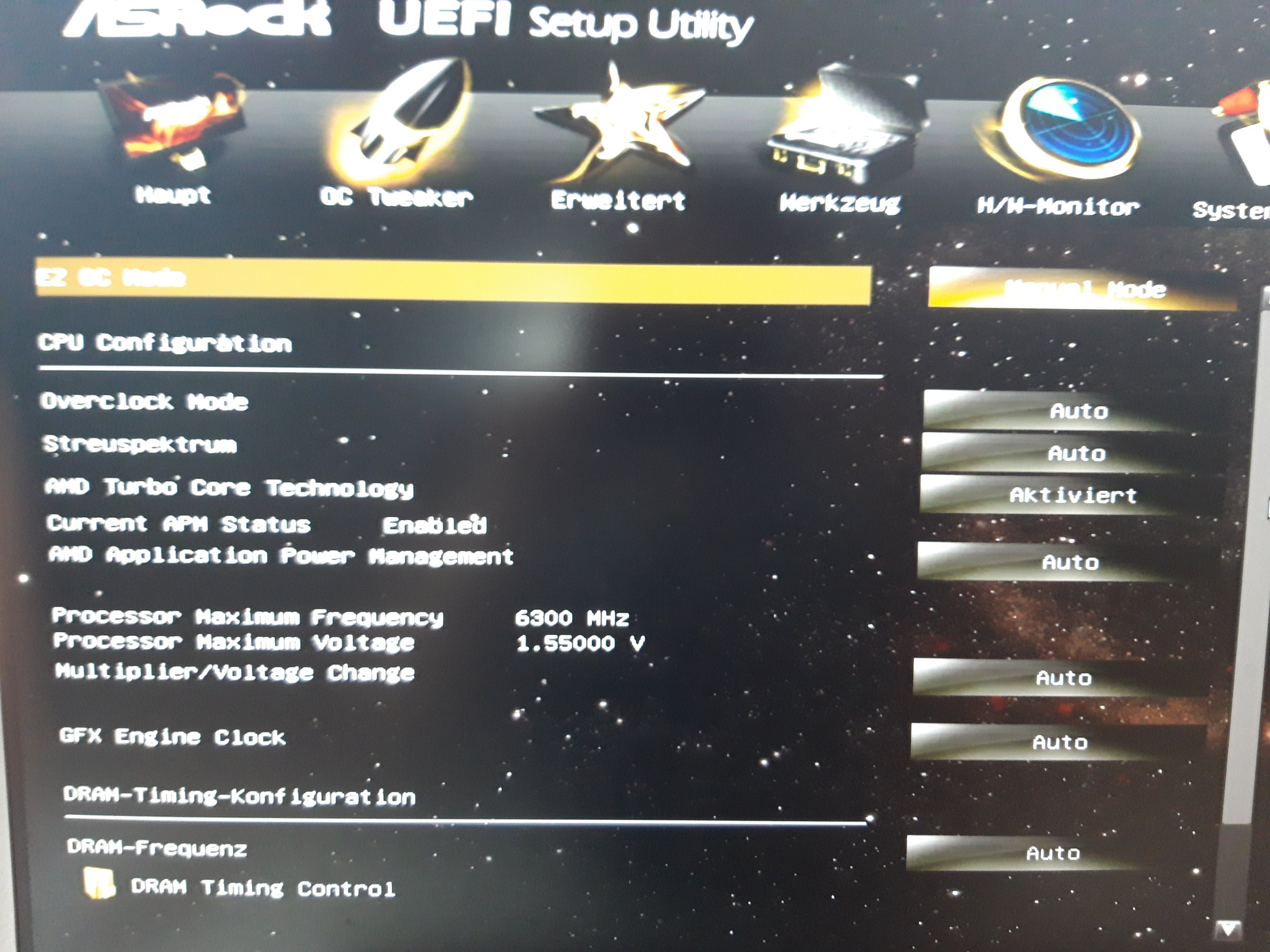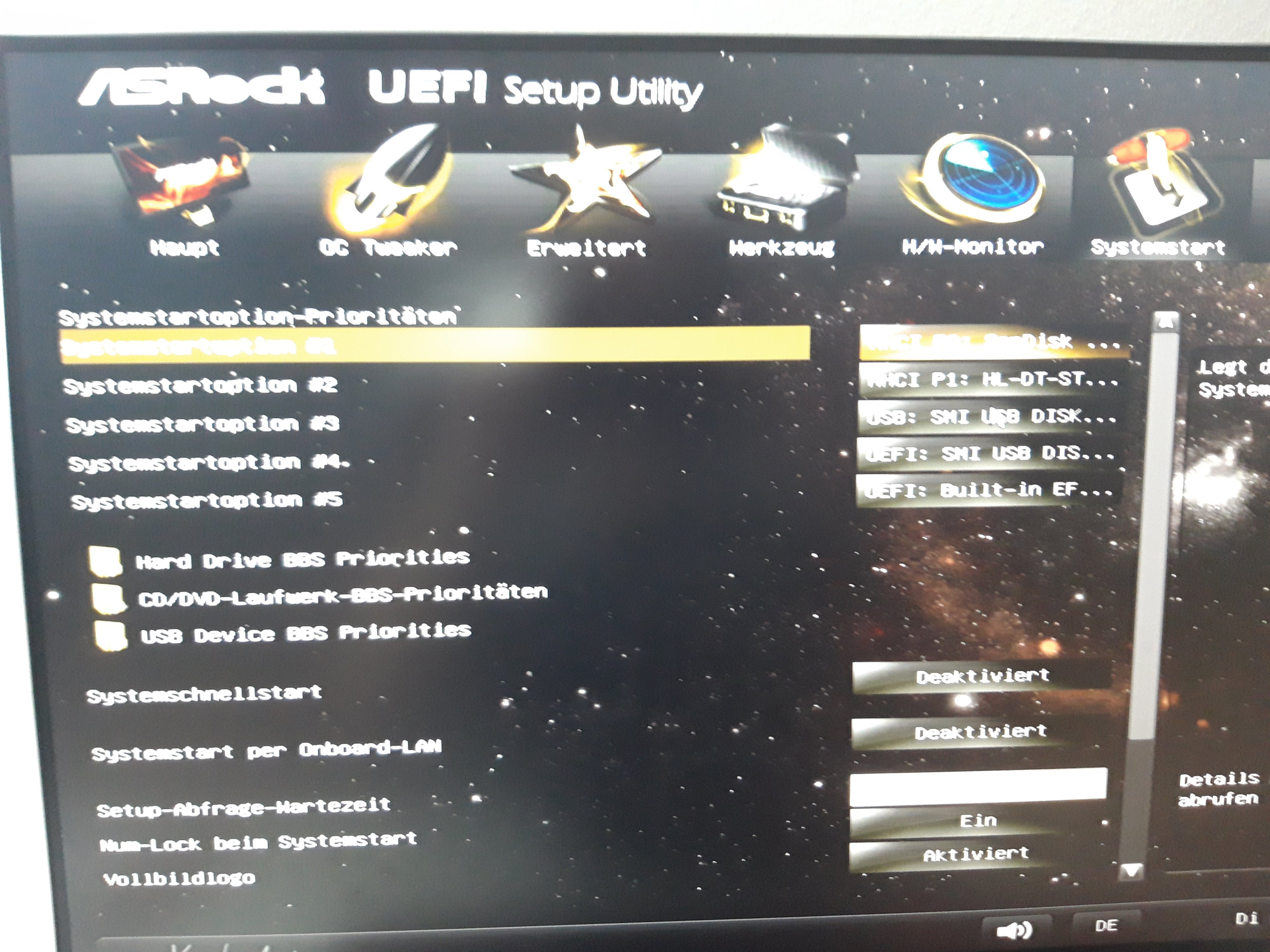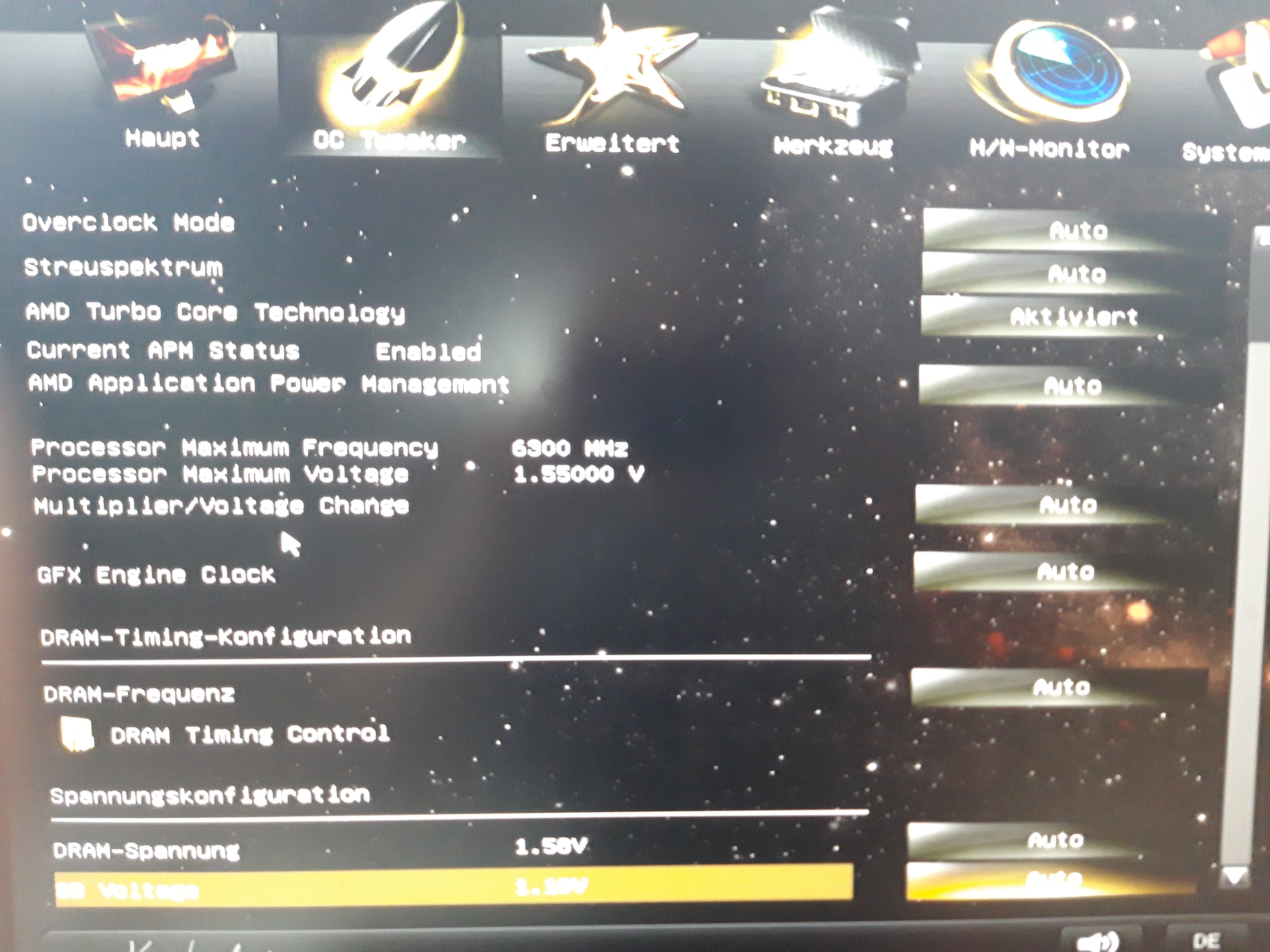 Hab das eben Probiert, klappt nix. Ich versuche mal den PC mit nur einem RAM Riegel ins BIOS zu booten, dann mit dem 2. Hier noch ein BIOS Screen von welchen ich keine Ahnung habe. Danke für eure schnelle Hilfe <3Siran schrieb:@0x8100 Ja, das ist das merkwürdige, evtl. hilft da mit F9 mal die optimal settings laden, vielleicht hat sich da was "verhakt" nach dem BIOS Update.