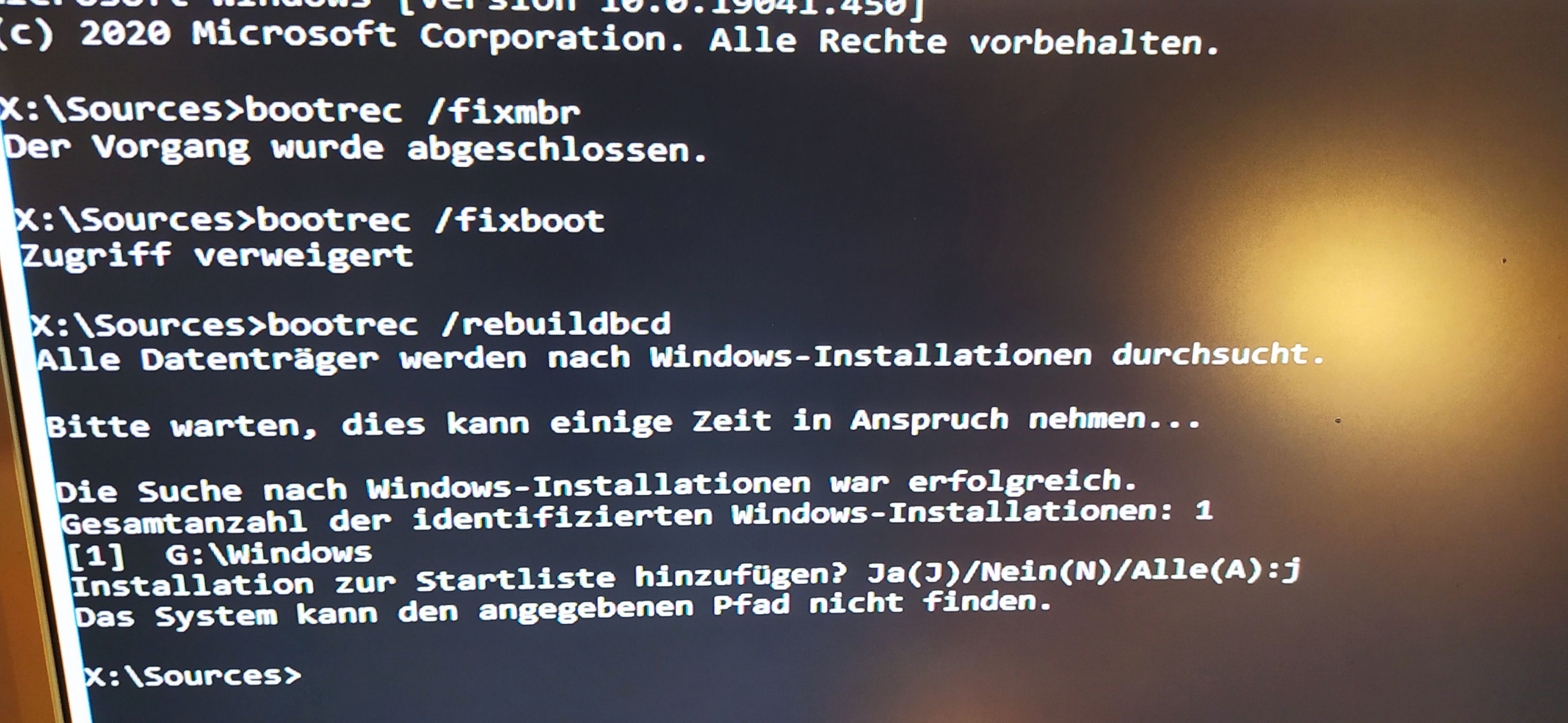 Reparaturoptionen mit WinInstallDisk wieder ohne Ergebnis, ebenfalls die gängigen Konsolenbefehle entweder verweigert oder ohne Auswirkung.