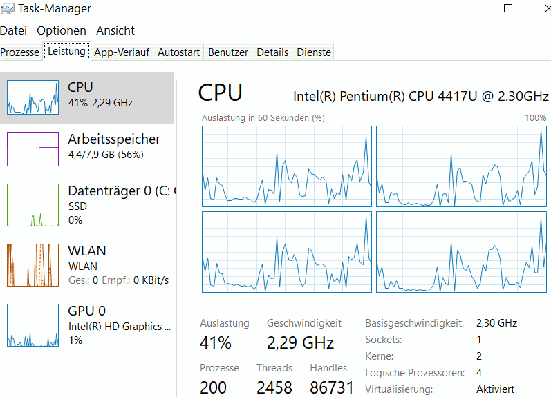 ◘ Wenn das Windows 10 läuft und ich den Task-Manager öffne, um die CPU-Leistung auszulesen: