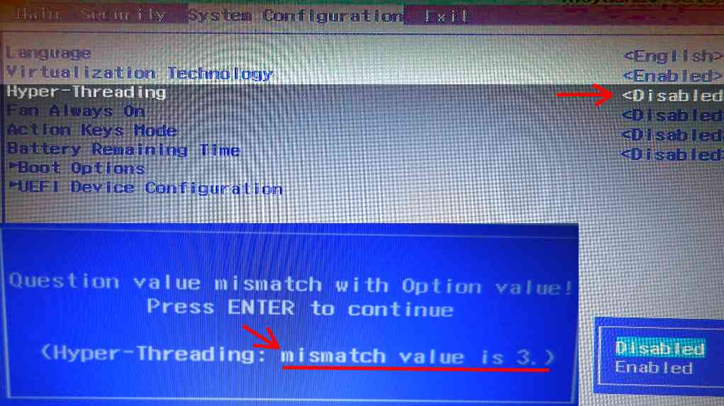 + Meldung: "Mismatch with Option value! Hyper-Threading: mismatch value is 3"