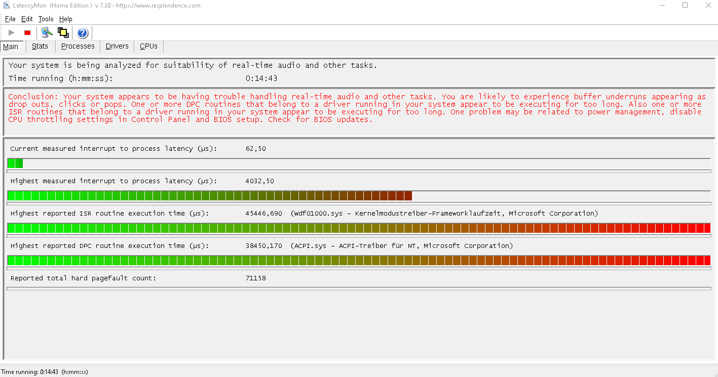 Was mir aufgefallen ist, ich habe LatencyMon mal installiert und da ist laufend was anderes im roten Bereich ... mal ACPI.sys, wdf01000.sys, HDaud.sys und und und ... immer was neues :-(