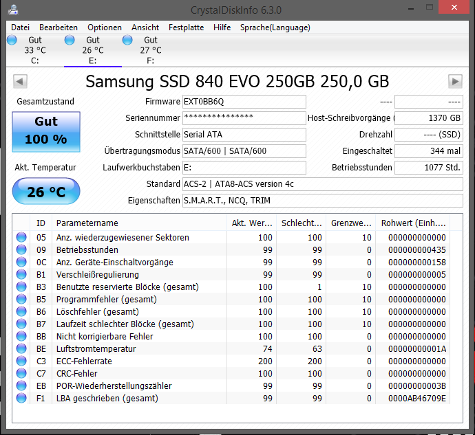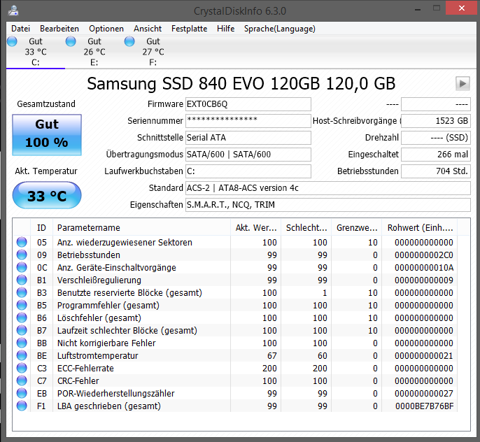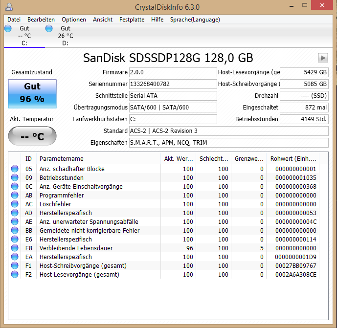 compro20, poste bitte mal den Screen von CrystalDiskInfo (die Portable Standard Edition reicht und ist frei von Werbung), ziehe aber bitte das Fenster soweit auf, dass alle Attribute und auch die Rohwerte vollständig sichtbar sind. Dann kann man vielleicht nachvollziehen, was da passiert ist, bzw. welches Attribut dort wie interpretiert wurde.