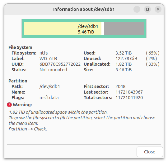 Moin! Mein fast volles internes 4 TB Datengrab von Seagate hat in letzter Zeit Geräusche gemacht und manchmal verzögert beim Zugriff auf Dateien reagiert, weswegen ich die Platte mit dd auf eine interne 6 TB von WD rüberkopiert habe. Für Datenträger 1 zeigt die Datenträgerverwaltung von Windows 5589,03 TB an, ein Rechtsklick auf Eigenschaften aber nur eine Speicherkapazität von 3,63 TB.