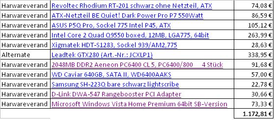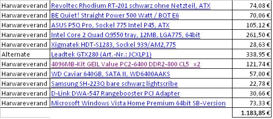 einige nutzer im forum haben probleme bei der kombination gtx280 + be quiet netzteil. ich würde ein anderes netzteil nehmen, welches sicher mit der graka funktioniert und auch genügend ampere auf den 12volt schienen bietet. z.b.: http://geizhals.at/deutschland/a312982.html natürlich hat dieses auch die benötigten 8er und 6er pcie stromstecker. bei der gtx280 würd ich noch a bissarl was (ca30 euro) drauflegen und mir eine gemoddete von edelgrafikkarten holen, die bestellst du ja eh wo anders. die sind leiser als das orginal, per bios mod passend undervolted (verbraucht dann nicht ganz so viel Strom) und bleiben damit sogar kühler (kein heatbug).