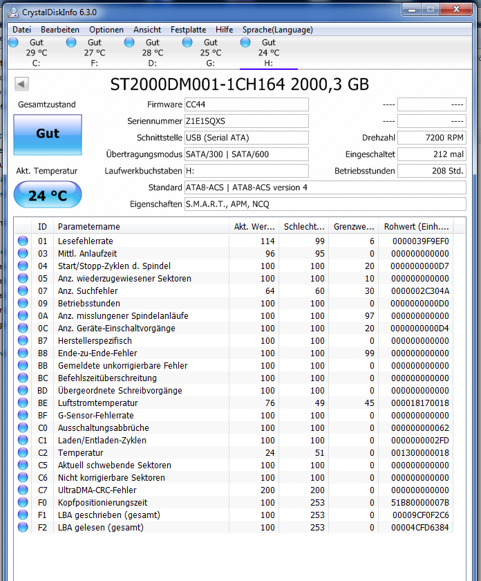 Bzgl. des Zustands der Platte poste bitte mal den Screen von CrystalDiskInfo (die Portable Standard Edition reicht und ist frei von Werbung), ziehe aber bitte das Fenster soweit auf, dass alle Attribute und auch die Rohwerte vollständig sichtbar sind.