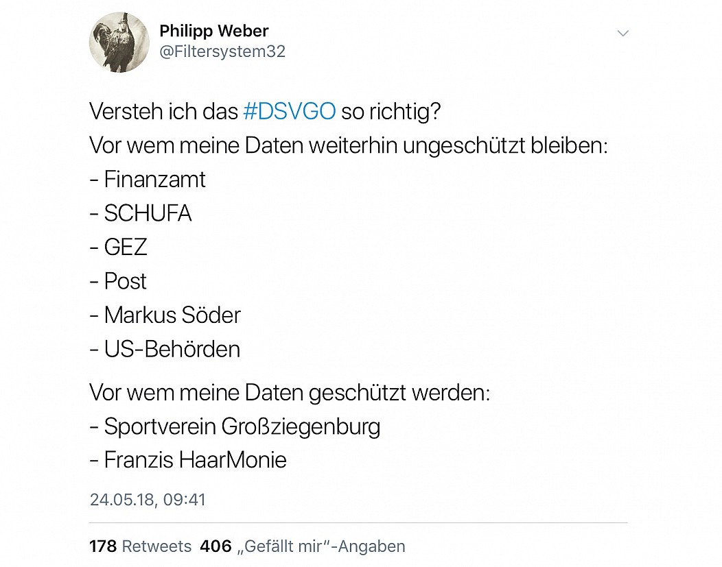 Ich hoffe, dass das im Sande verläuft. Den Mist DSGVO hat kein Mensch gebraucht. Ich fühle mich kein Stück besser, seit sie in Kraft ist und mache über den Mist auch keine Gedanken.