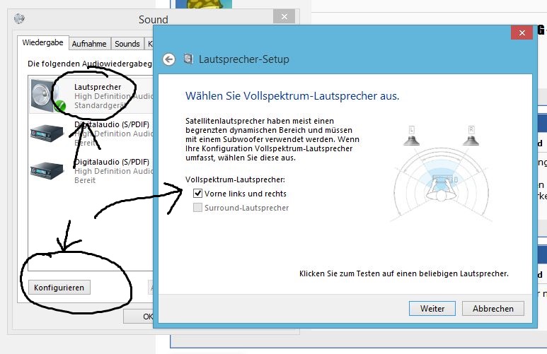 geh mal wie auf meinem pic auf den schalter konfig und klick dich durch. lass mal musik laufen und spiel mit dem vollspectrum dingens rum. das ist für boxen ab 20 hz also mit vollem frequenzbereich also auch für die fetten bässe die ja bekanntlich weit unten liegen. ist vollspectrum wie default dagegen auf aus gestellt dann wird von windows, so voreingestellt, nur alles über 100hz aufwärts angesteuert und das nimmt den ganzen bass bei 2.0 lautsprechern.
