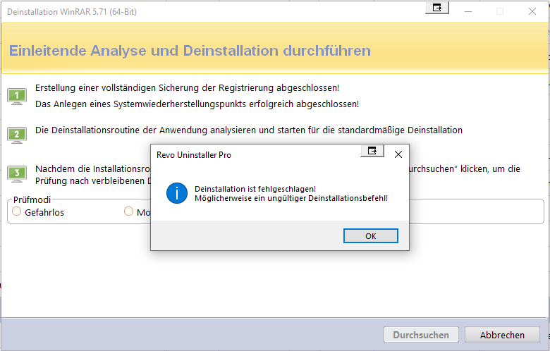 Nun lassen sich Programme nicht mehr deinstallieren. Auch nicht mit dem Revo Uninstaller. Die Fehlermeldung habe ich als Anhang angehangen. Kann auch nicht funktionieren, da das Deinstallationskommando auf das Laufwerk D verweist.