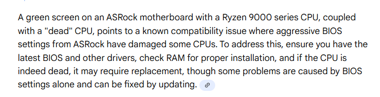 oder das bekannte ASROCK-RYZEN9000 Problem? Da kam auch der Green Screen in manchen fällen vor.