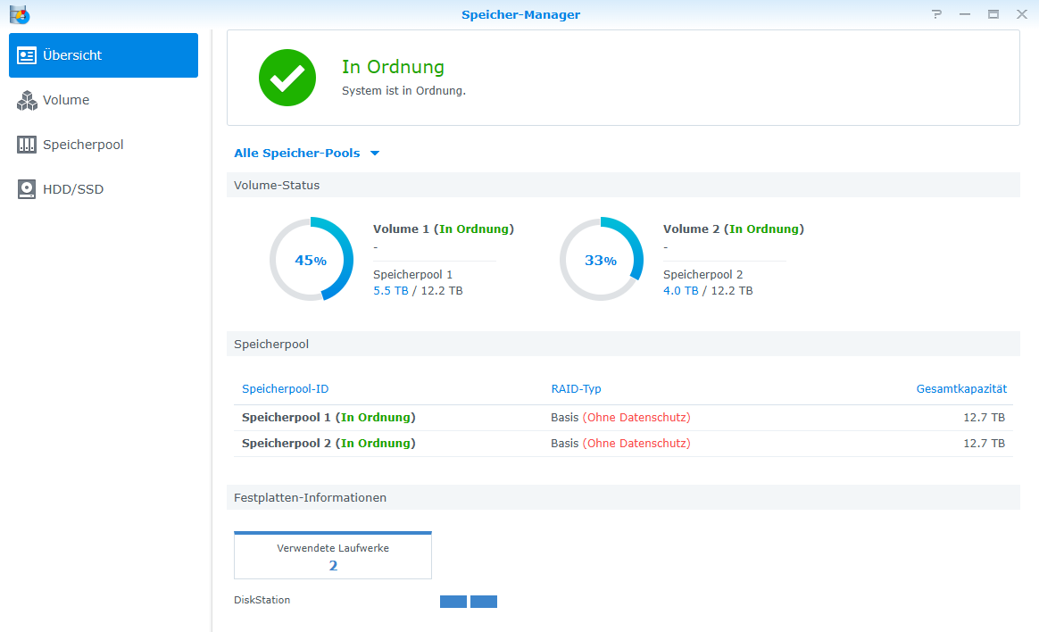 Die HDDs wurden gebraucht gekauft, sind also nicht neu. Vor dem Einbau am PC mit Crystal Disk Info überprüft und alles war OK. Auch das NAS selbst sagt die beiden Platten sind in Ordnung. Das NAS selbst zeigt mir bei der Datenträgerauslastung 0% an, ich kann also nicht erkennen ob die im Hintergrund irgendwas geschrieben wird. Unter CPU werden mir 4 aktive Prozesse angezeigt