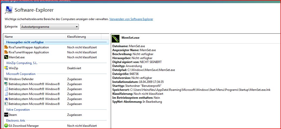 letzte Woche habe ich das SP 2 installiert und festgestellt, dass die im Autostart befindlichen Programme "Memset 4.0, RivaTuner 2.24" ungewöhnlich lange brauchen, bis sie tatsächlich gestartet werden. In dieser Zeit kann ich auch Everest oder das Windows Mail nicht öffnen.