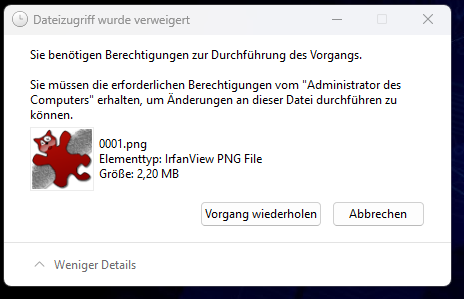 Ich habe mir einen neuen PC gekauft, mit Win11 Home. Zuvor hatte ich Win10. Nach der Installation von Win11 habe ich noch 2 weitere Festplatten eingebaut. Nach dem Einbau habe ich festgestellt, dass ich verschiedene Ordner (hauptsächlich diejenigen, in denen sich meist nur Bilder und Videos befinden) nicht mehr öffnen kann. Unter Zuhilfenahme von YouTube konnte ich mir zu einigen Ordnern wieder Zugriff verschaffen. Doch das funktioniert nicht bei allen Ordnern. Da gibt es Ordner, bei denen ist die Herstellung der Berechtigung nicht möglich. Es erscheint eine Fehlermeldung, dass die sich im Ordner befindlichen Dateien nicht anpassen lassen. Die einzelnen Dateien kann ich aber freimachen. Da es aber jede Menge Dateien sind, welche einzeln freigegeben werden müssten, wäre es eine schier unendliche Arbeit. Gibt es jemand, der das Wissen besitzt, wie dieses Problem schnell gelöst werden kann. DAS WÄRE SUPER.