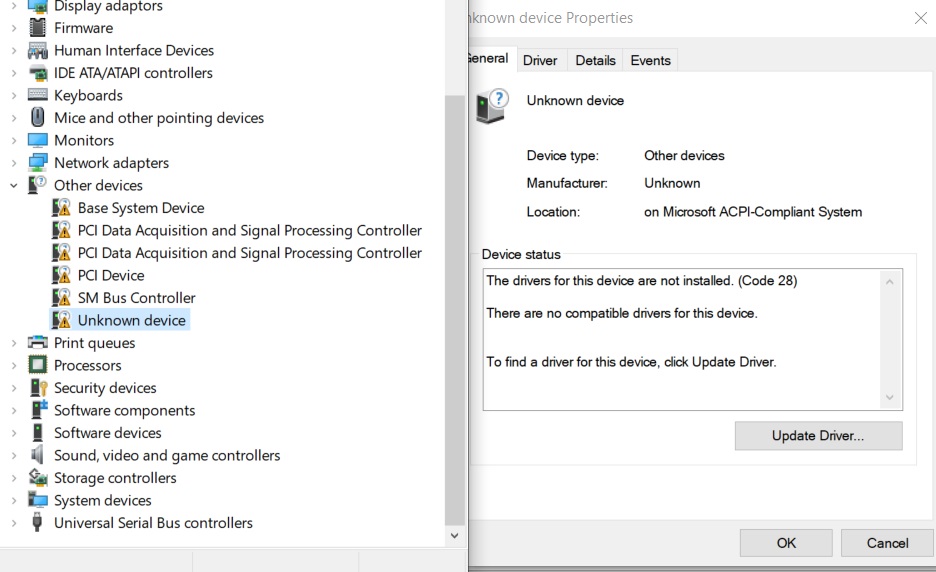 Danke an @floklo4 der mir mit 5 Treibern geholfen hat. Für Leser des gleichen Problems (siehe Bild1): Die suche nach dem 5. Treiber (SM Bus Controller) und dem Hersteller den ich nicht kannte (Intel), gibt dir diesen Treiber: Intel Chipset Software Installation Tool (er hat zumindest bei mir die "anderen" Geräte, die einen Namen haben, nun mit Treiber versehen. (Auf der Hersteller Seite für mein Model - Asus Fx504g - gab es diese Software/die Treiber nicht)