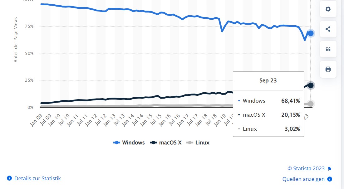 Richtig, im Desktopbereich, wo eben nicht alles einfach funktionieren muss.Linux hat nach 20 Jahren immer noch nur 3,5 % Marktanteil.