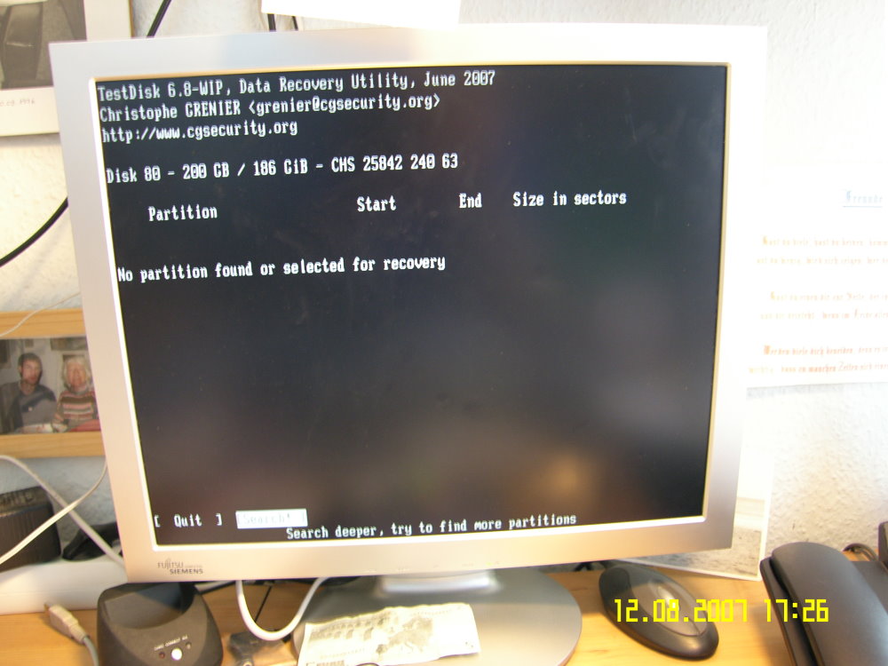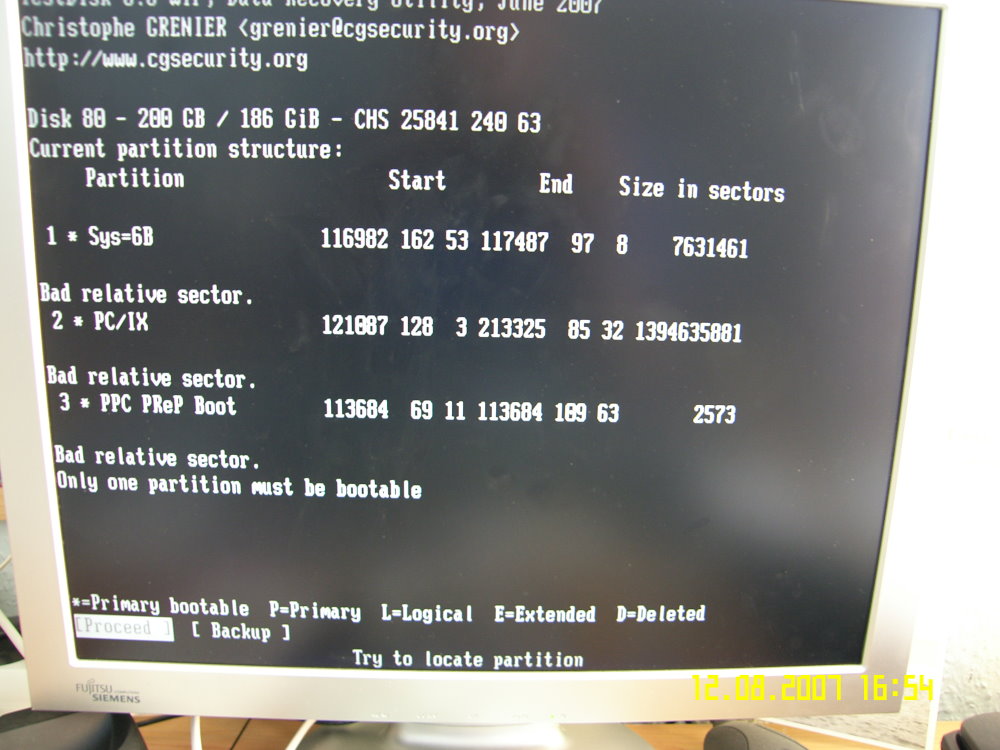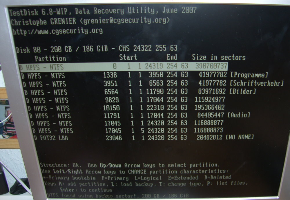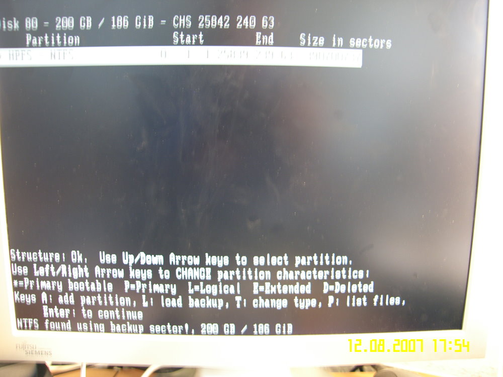 Nun wollte ich das Ganze mit Win2000 ausprobieren. Da gibt es die o.g. Probleme mit dem schwarzen Bildschirm nicht, sondern es klappte ganz normal. Später werden mir dann die noch vorhandenen Partitionen angezeigt, die wie sie vorher waren aber nicht mehr vorhanden waren ( Laufwerksbuchstaben werden nicht mehr angezeigt, es steht, dass die Partionen entweder ein unpartitionierter Bereich oder einfach unbekannt sind.