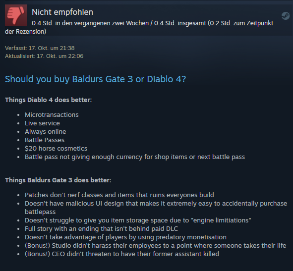 Nur weil die Grafik ok ist - aber nicht best-aussehend - heißt das nichts, wenn es kein Endgame gibt, die Gegner generisch öde und immer gleich sind und vor allem das Loot in seiner Form sinnfrei ist. Masse, null Lore-Bezug, selbst die Uniques / Legendaries sind generisch und langweilig. Was hat man sich früher über ein Shako gefreut oder Andy Face. Selbst in D3 gab es wiedererkennbare Items. In D4 Fehlanzeige.