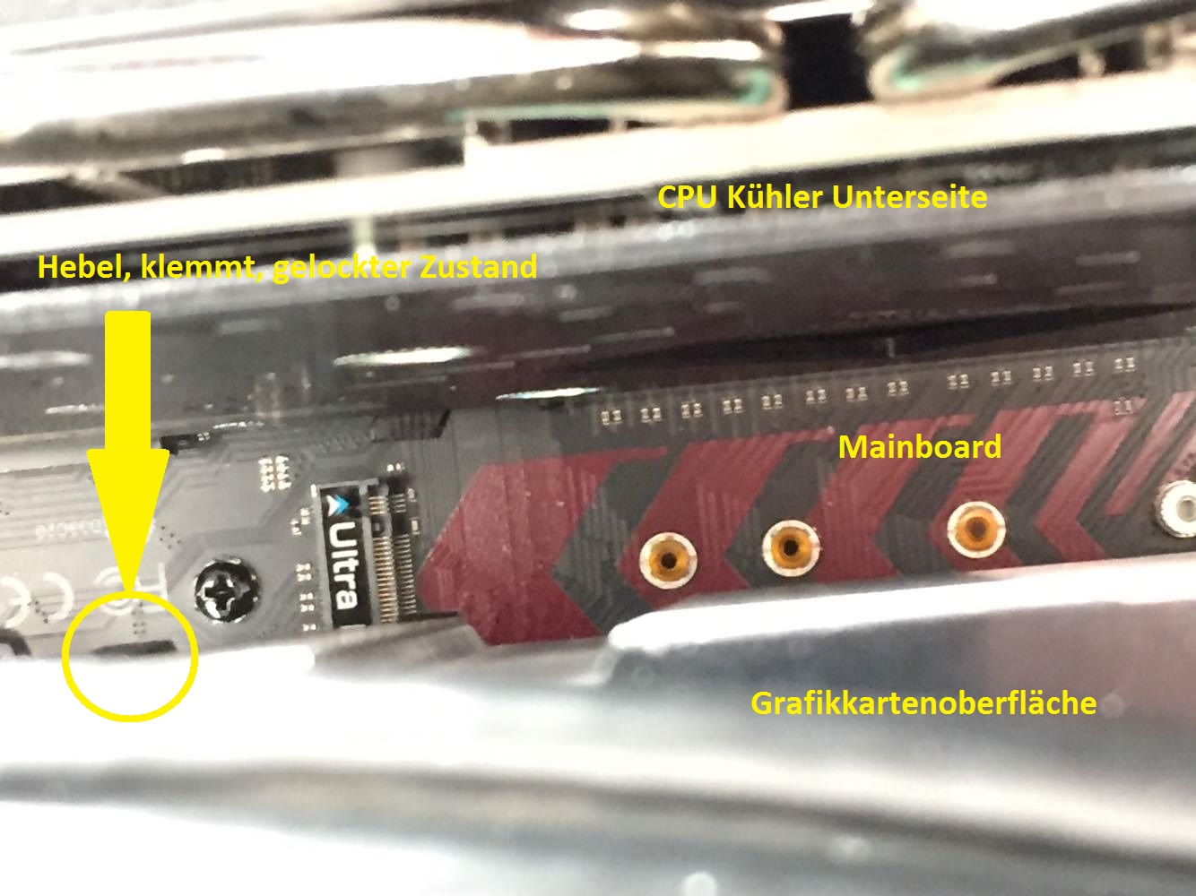 Ergänzung: Ich komme auch nur an den oberen Hebel, der untere ist komplett von der Grafikkarte verdeckt!