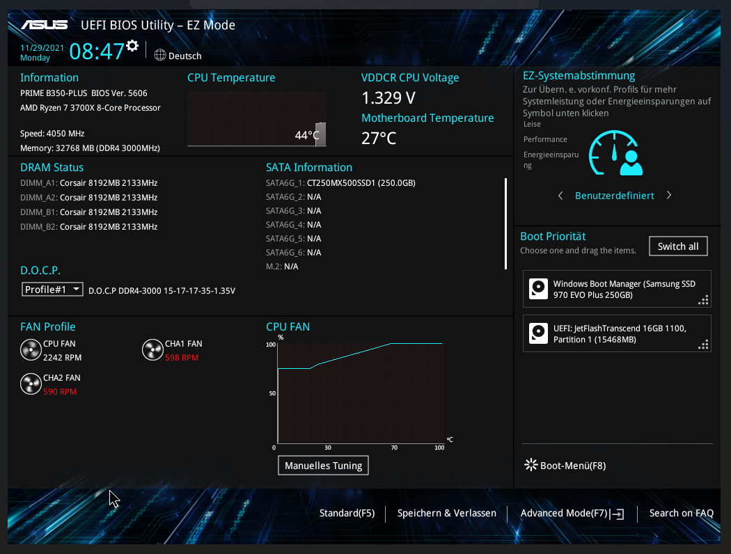 Mal den SATA Port wechseln werde ich nachher ausprobieren. Also die Boot-SSD steckt im SATA 2 und die 1TB steckt im SATA 1. Die werde ich nachher mal austauschen und Morgen mal schauen, ob es wieder beim Kaltstart so ist.