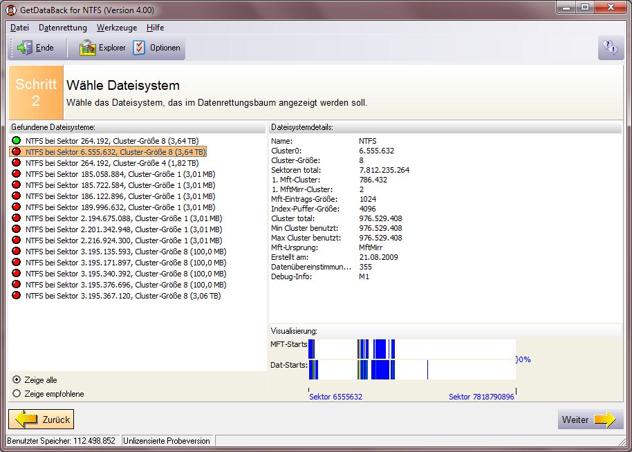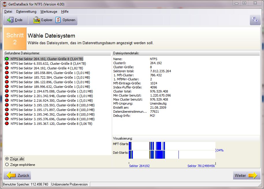 NTFS bei Sektor 264.192, Cluster-Größe 8 (3,64TB)