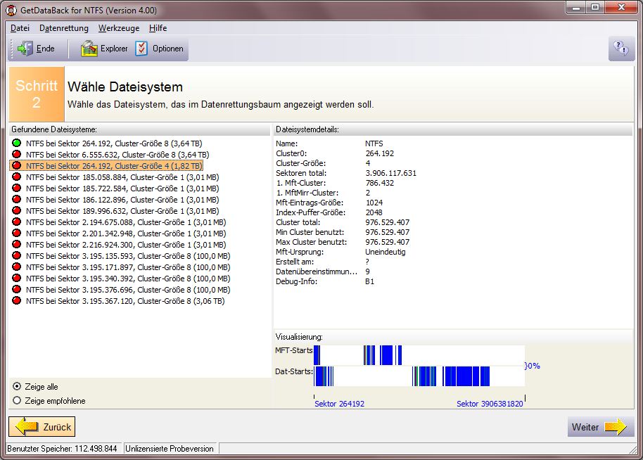 NTFS bei Sektor 264.192, Cluster-Größe 4 (1,82TB)