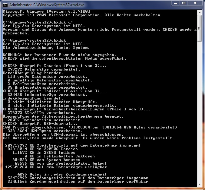 ich hab chkdsk d: ausgeführt und er brach nach Erkennung des NTFS mit folgender Fehlermeldung ab (siehe Bild).