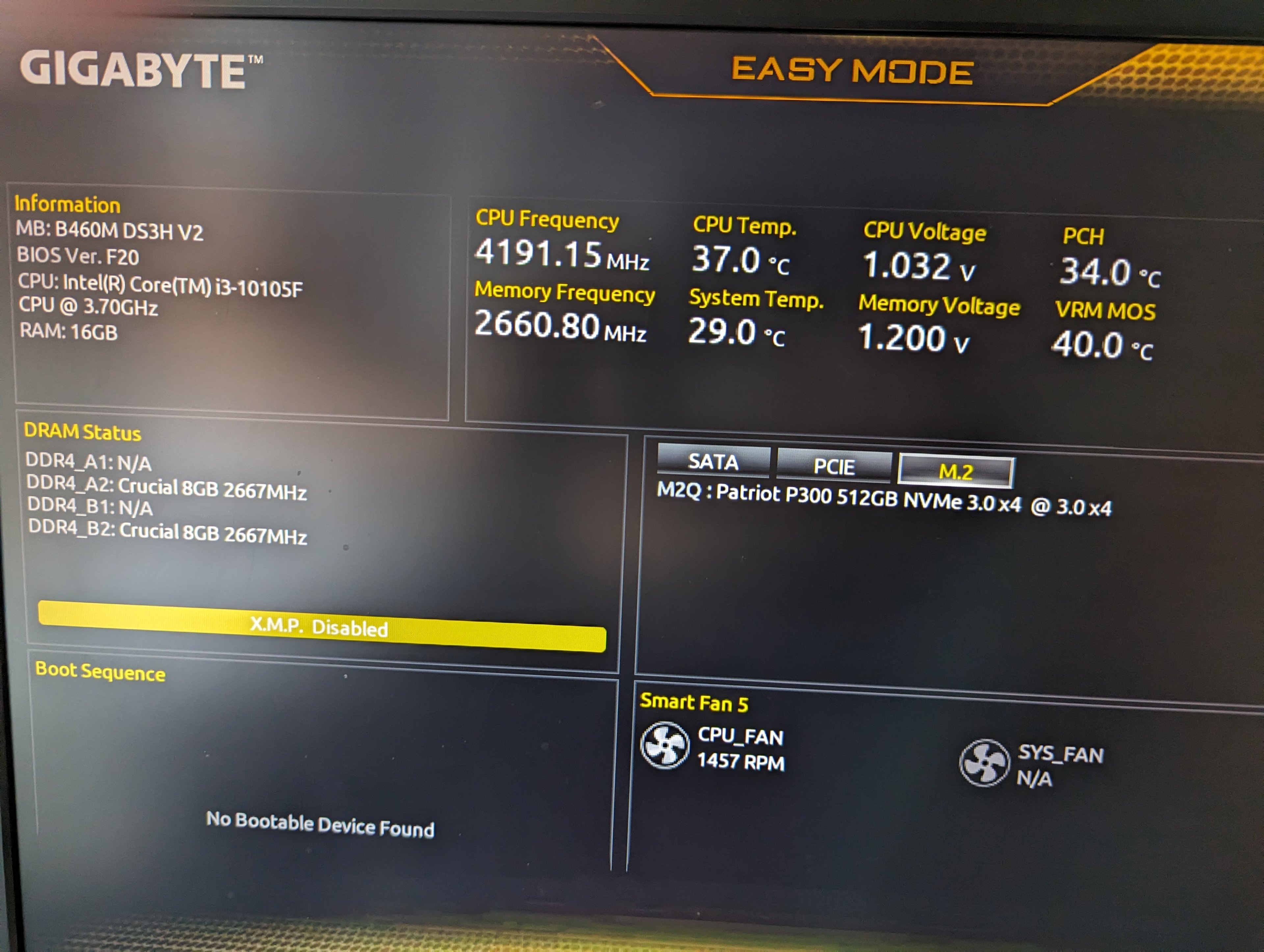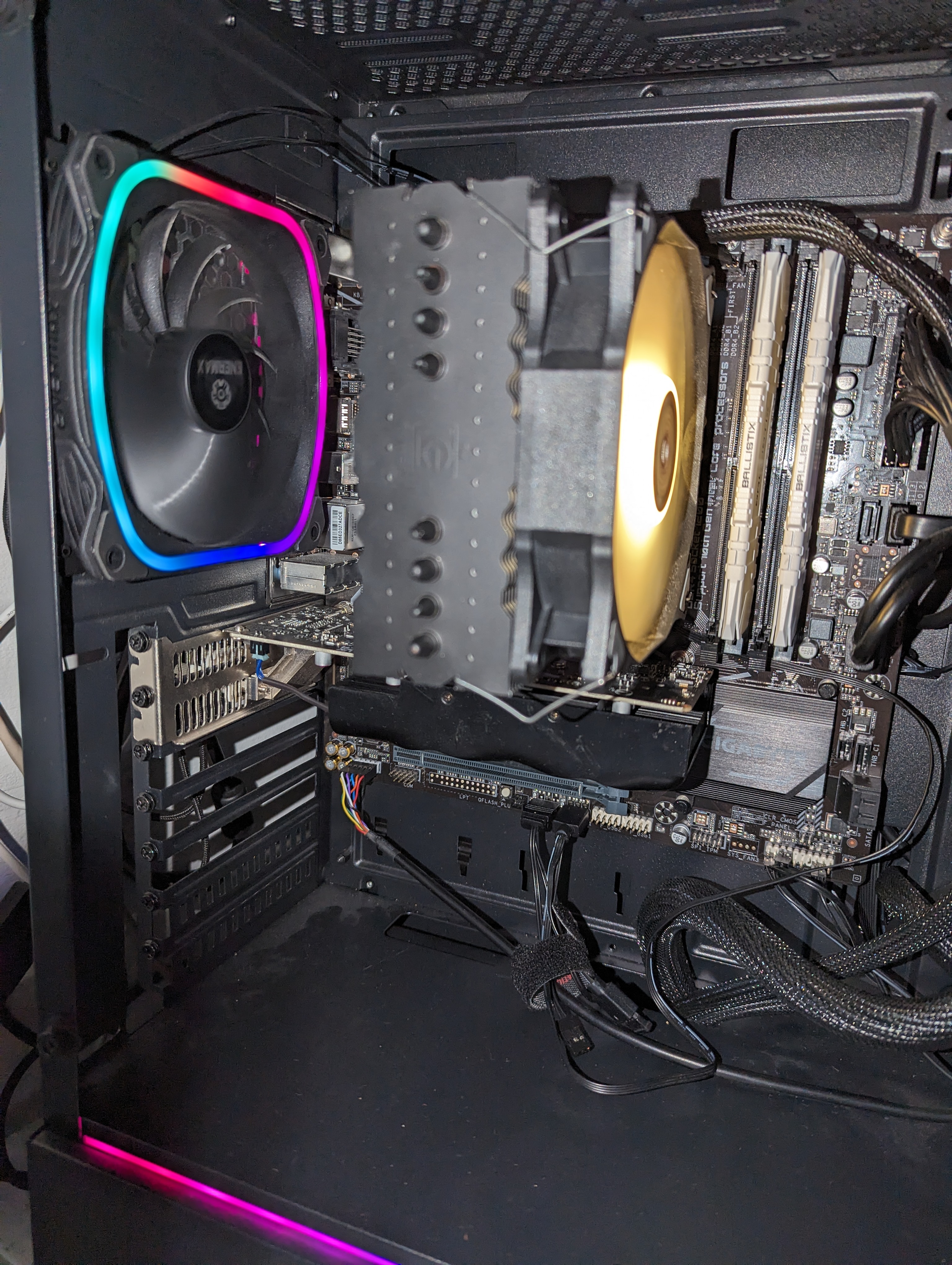 ich habe letztens neue RAM Sticks gekauft, bisher habe ich BALLSTX 2x8 gb 2666mhz ddr4 Sticks benutzt, heute kamen sie and nämlich hab ich Vengeance RGB pro 2x16 gb 3200mhz ddr4 Sticks gekauft und wollte sie heute Einbauen. Als Mainboard benutze ich das Gigabyte B460M DS3H V2. Hab den PC auf gemacht und vor dem ram Wechsel habe ich zuerst mein CPU kühler angeschraubt und neue Therme leitpaste auf die CPU gemacht da ich die seit 3 Jahren nicht berührt habe. Danach CPU kühler wieder dran gemacht und dann war der RAM dran. Ich habe meine jetztigen RAM Sticks raus genommen und die neuen rein gemacht (auf dem A2 und B2 Plätzen) danach hab ich im Internet nachgeguckt was eigentlich passiert wenn man beide ramsticks mit unterschiedlichen mhz und gb Anzahlen mischt, und anscheinend brachte das für einige was und machte auch keine Probleme, also hab ich meine alten RAM Sticks in die anderen übergebliebenen Slots rein gemacht (A1 und B1) und startete mein PC. Hab mein Power Knopf betätigt und die Lüfter fingen an sich zu drehen und zu leuchten soeben haben die neuen RAM Sticks auch geleuchtet, was aber sehr merkwürdig war das der Lüfter des CPU kühlers sich nur gedreht hat und nicht geleuchtet hat, obwohl der Led Stecker angeschlossen war. Und paar Sekunden danach bemerkte ich auch das ich kein Bild bekam und das die Tastatur und Maus nicht geleuchtet haben. Also hab ich den PC wieder ausgemacht und meine alten RAM Sticks wieder raus genommen um zu gucken ob es vielleicht daran liegen kann. Selbe Reaktion. Dann hab ich die neuen wieder raus genommen und die alten rein getan und nochmals gestartet, und erst dann wo mein PC an ging hat auch der CPU kühler angefangen zu leuchten. Ich bekam ein Startup Bild von den Markenlogos doch danach gelang ich sofort in den BIOS ohne meine Tastatur zu betätigen, und wo ich versucht habe vom BIOS aus mein PC normal zu booten steht bei Boot sequence "No bootable device found" obwohl meine HDD sowie die SSD bei den SATA und M.2 Fenstern erkannt wird.