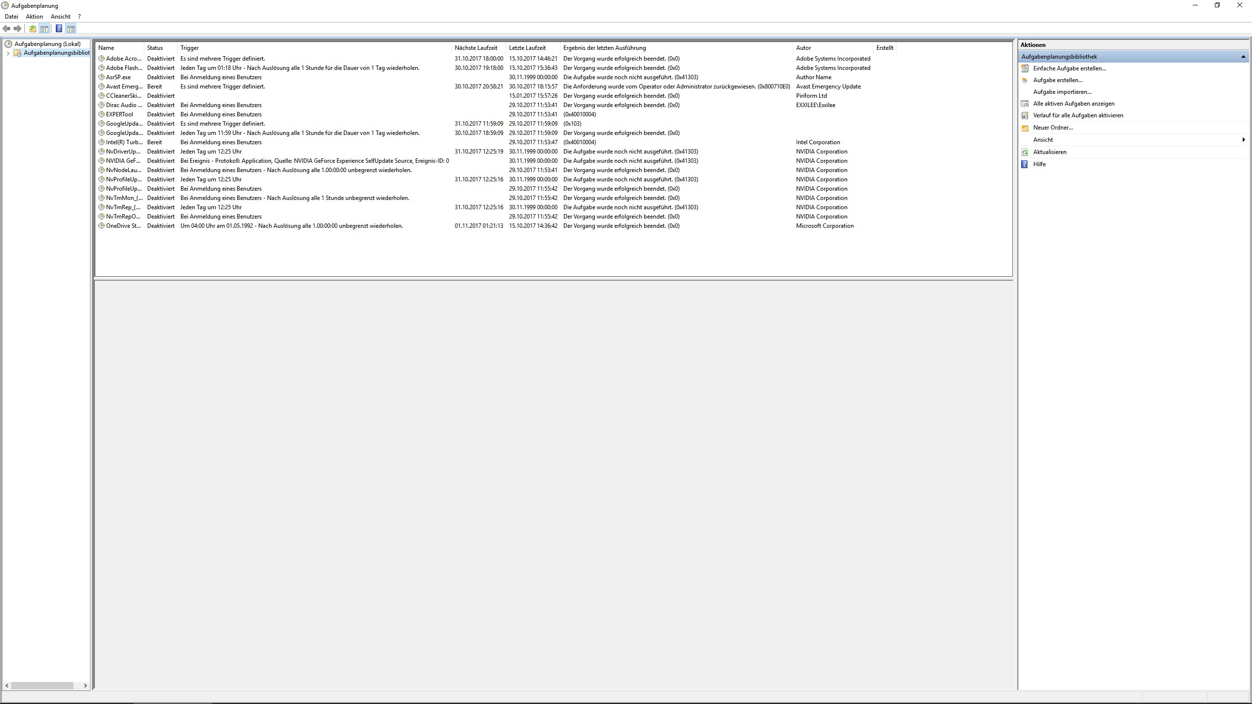 ich habe plötzlich ein Problem. Wenn ich meinen Rechner neu starte (oder herunterfahre und dann starte), werden alle Aufgaben in der Aufgabenplanung automatisch deaktiviert. Unter anderem meine SSD Software, Nvidia Programme, Lautsprecher Software (Sound), Grafikkarten Tuningprogramm und noch mehr.