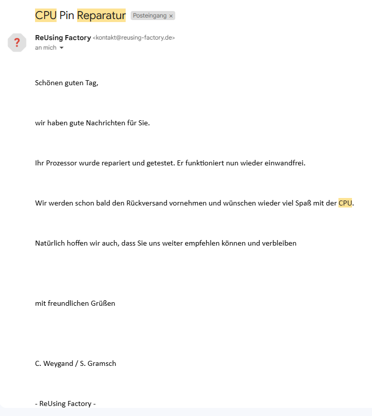 mit verbogenen Pins haben die wahrscheinlich die CPU tauschen müssen.