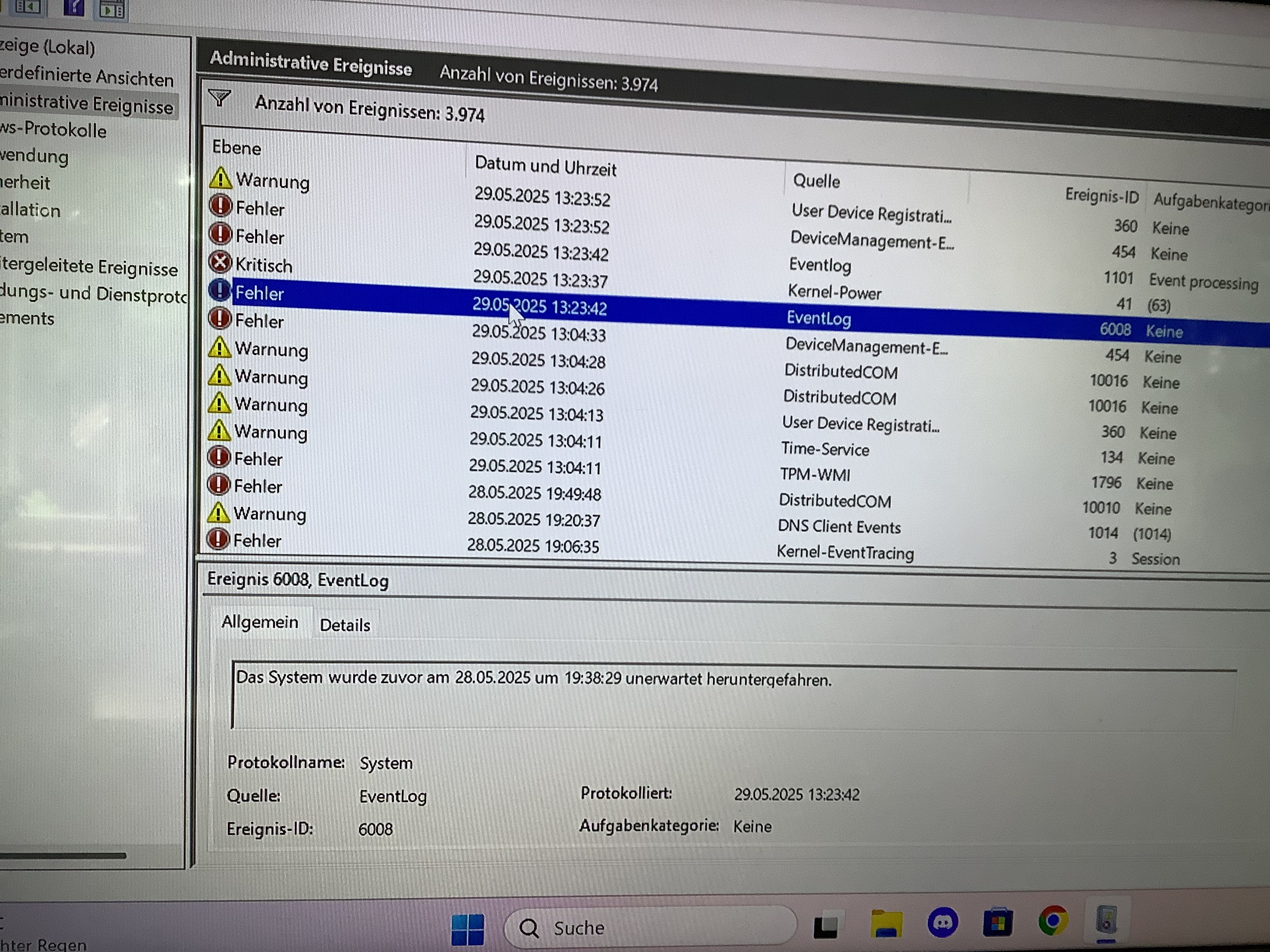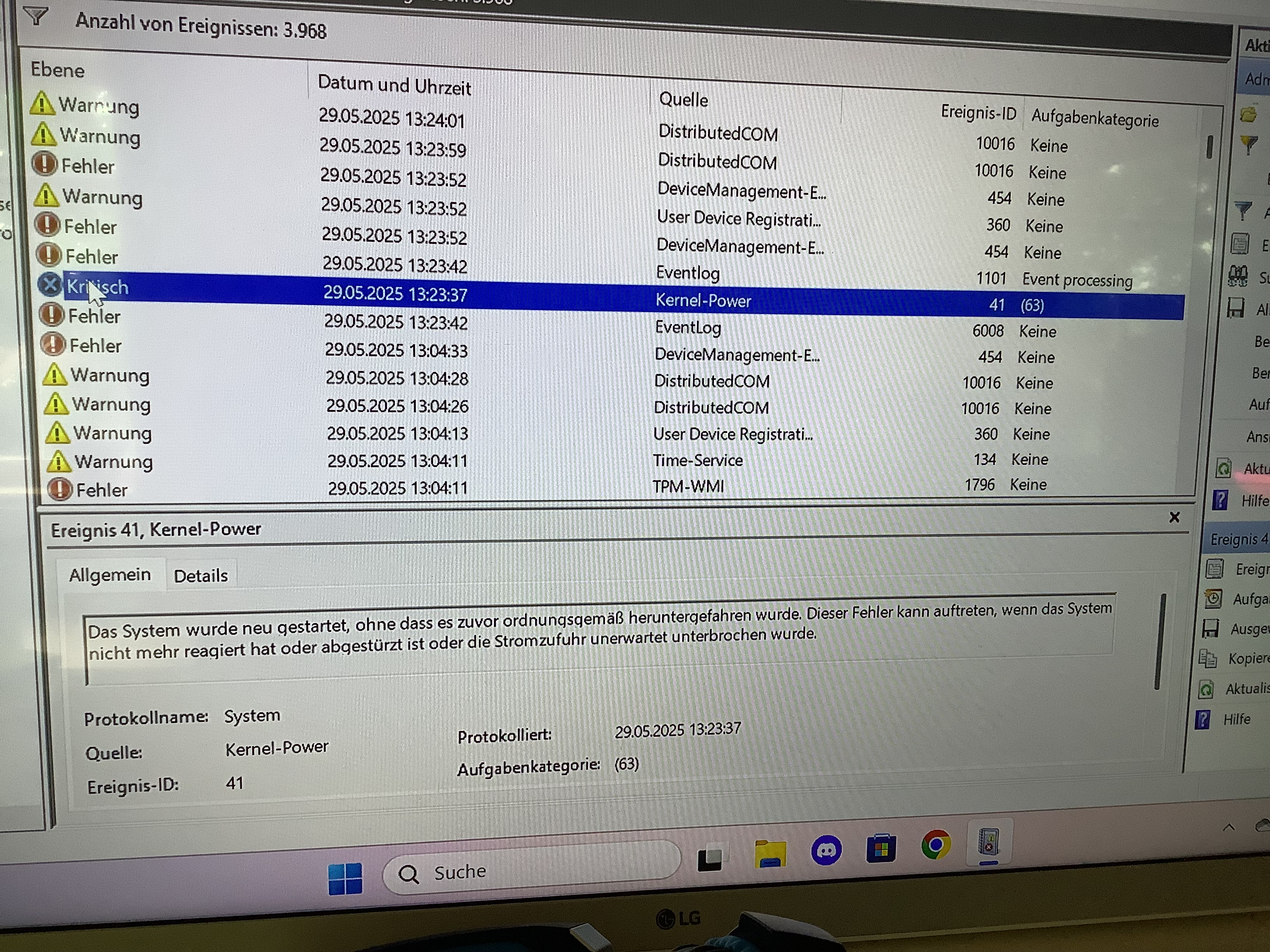 Man muss sich die Fehler vor dem "Kernel Power 41"-Eintrag anschauen.
