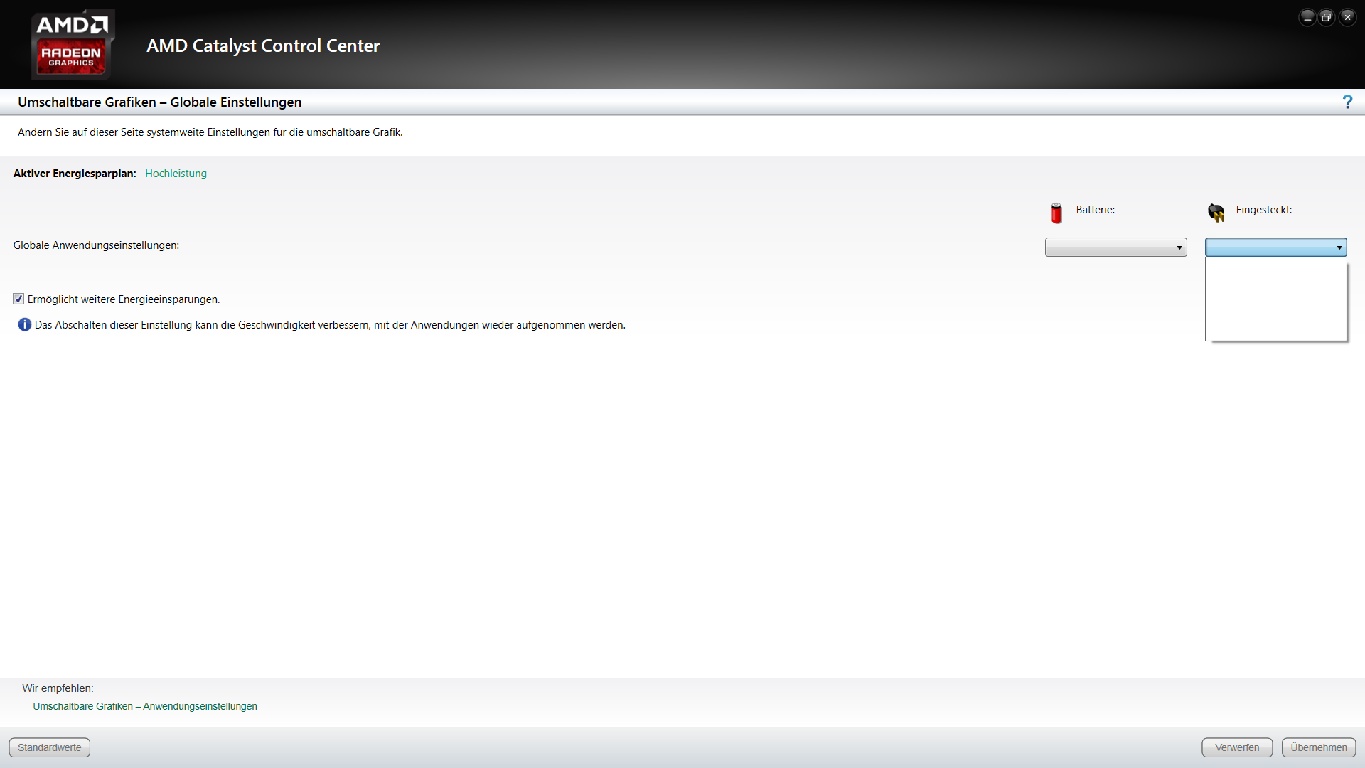 Also habe ich wie gewohnt das Catalyst Control Center geöffnet und auf "umschaltbare Grafiken - Globale Einstellungen" geklickt.