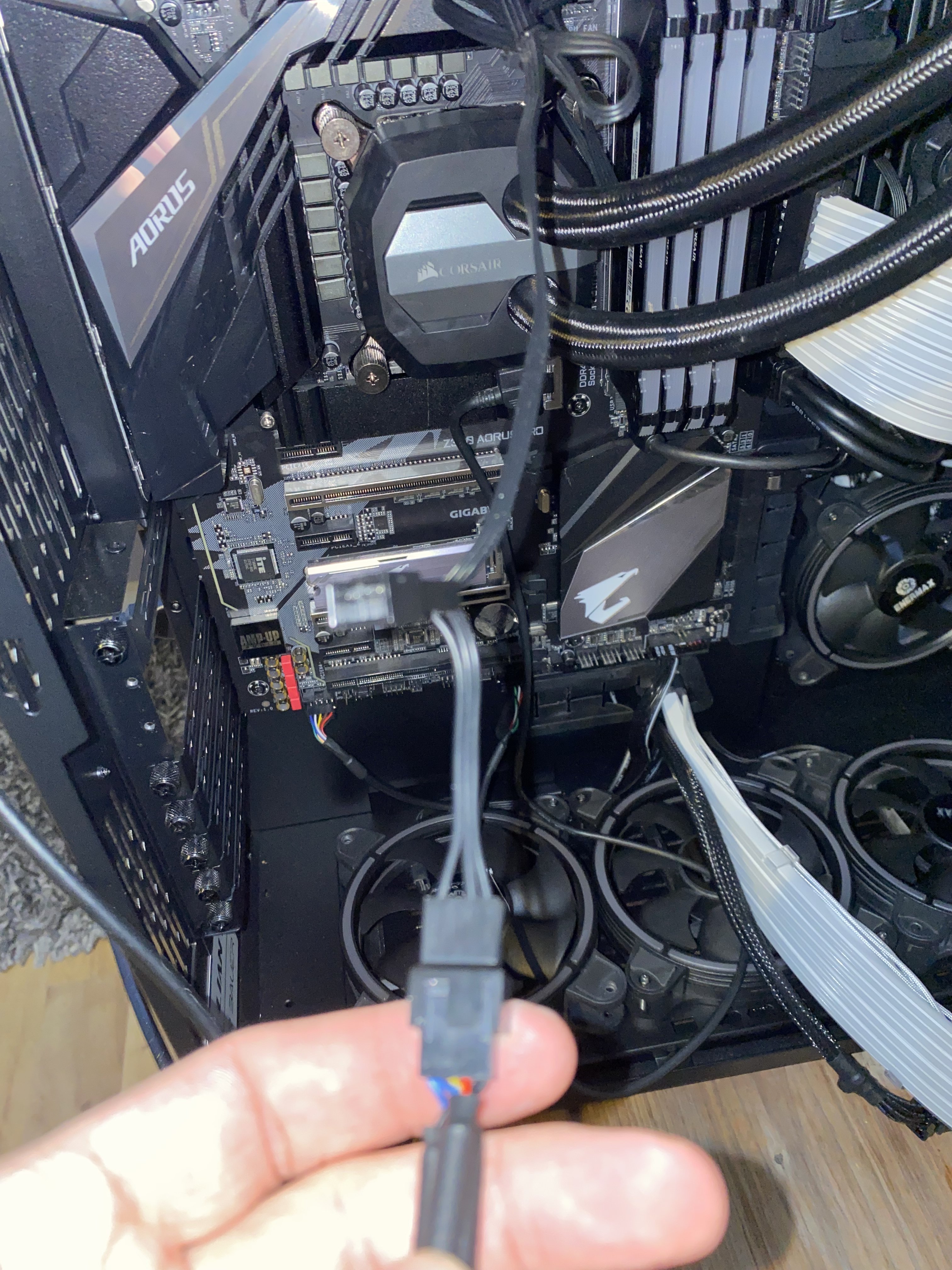 Ich habe heute mein neues Gehäuse bekommen und habe alles vom alten ins neue Gehäuse gebaut, auch meine Corsair H100i AiO WaKü. Nachdem ich alles umgebaut habe und den Pc das erste mal angeschlossen habe und anmachte, gluckerte die AiO kurz (gehe davon aus, dass sich das Wasser verteilt hat?) und danach lief sie ohne Geräusche. Ich Steuer ALLE Lüfter, auch die, die auf dem AiO Block sitzen über den Enermax rgb Controller. Jedenfalls fiel mir auf, dass der Pc total langsam lief, ich schaute nach den Temps und CPU ist im Idle schon bei 90 grad. Ich weiß nicht, was ich falsch gemacht habe. Neuer Wärmeleitpaste ist drauf, Kleber der Rückseite ist schon ewig ab, richtig montiert ist sie auch. Ich lade euch nochmal 2-3 Bilder hoch, wie ich es verkabelt habe. Evtl hab ich ja doch was vergessen, was mir nicht auffiel. Die 2 Stecker auf dem einem Bild, die in meiner Hand liegen.. ich erinner mich nicht mehr, was das war.. sind das die Anschlüsse für die Pumpe? Wenn ja, dann weiß ich ja, woran es liegt, weil die sind nämlich nicht angeschlossen.
