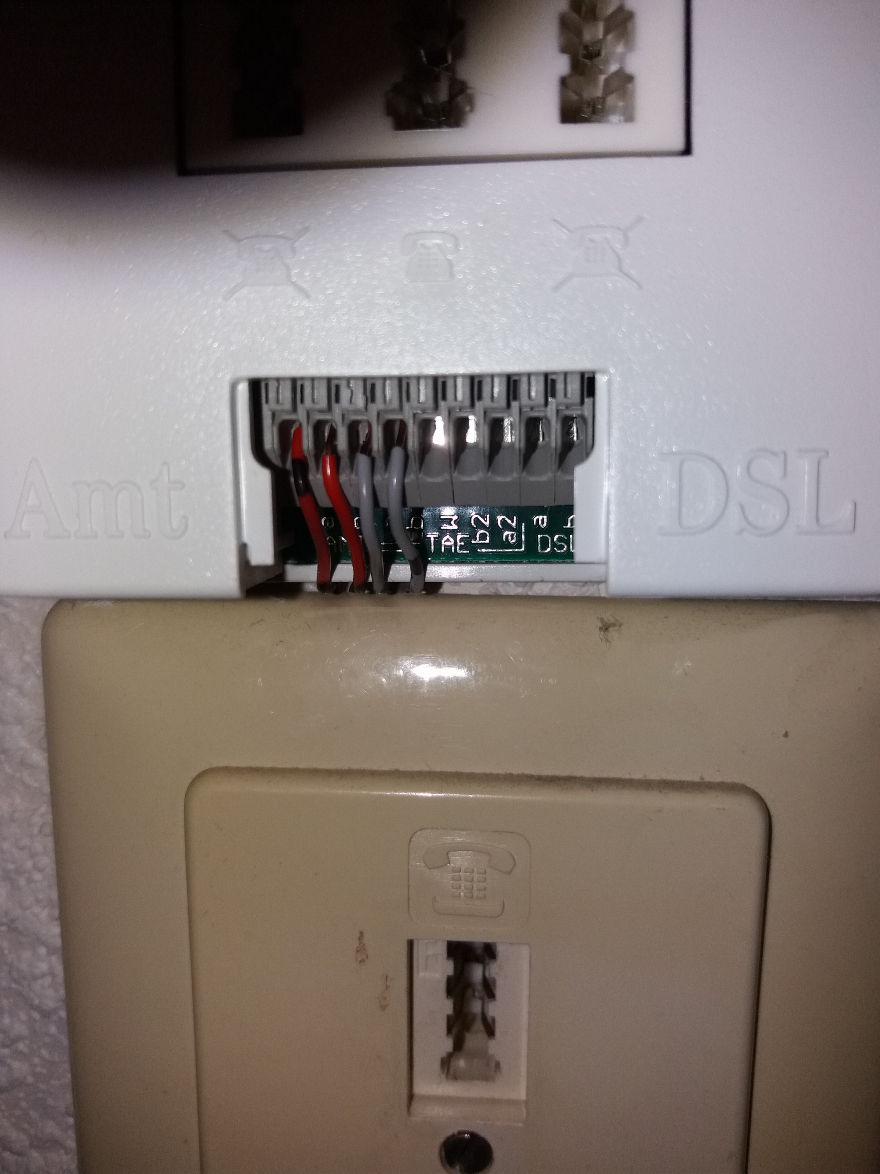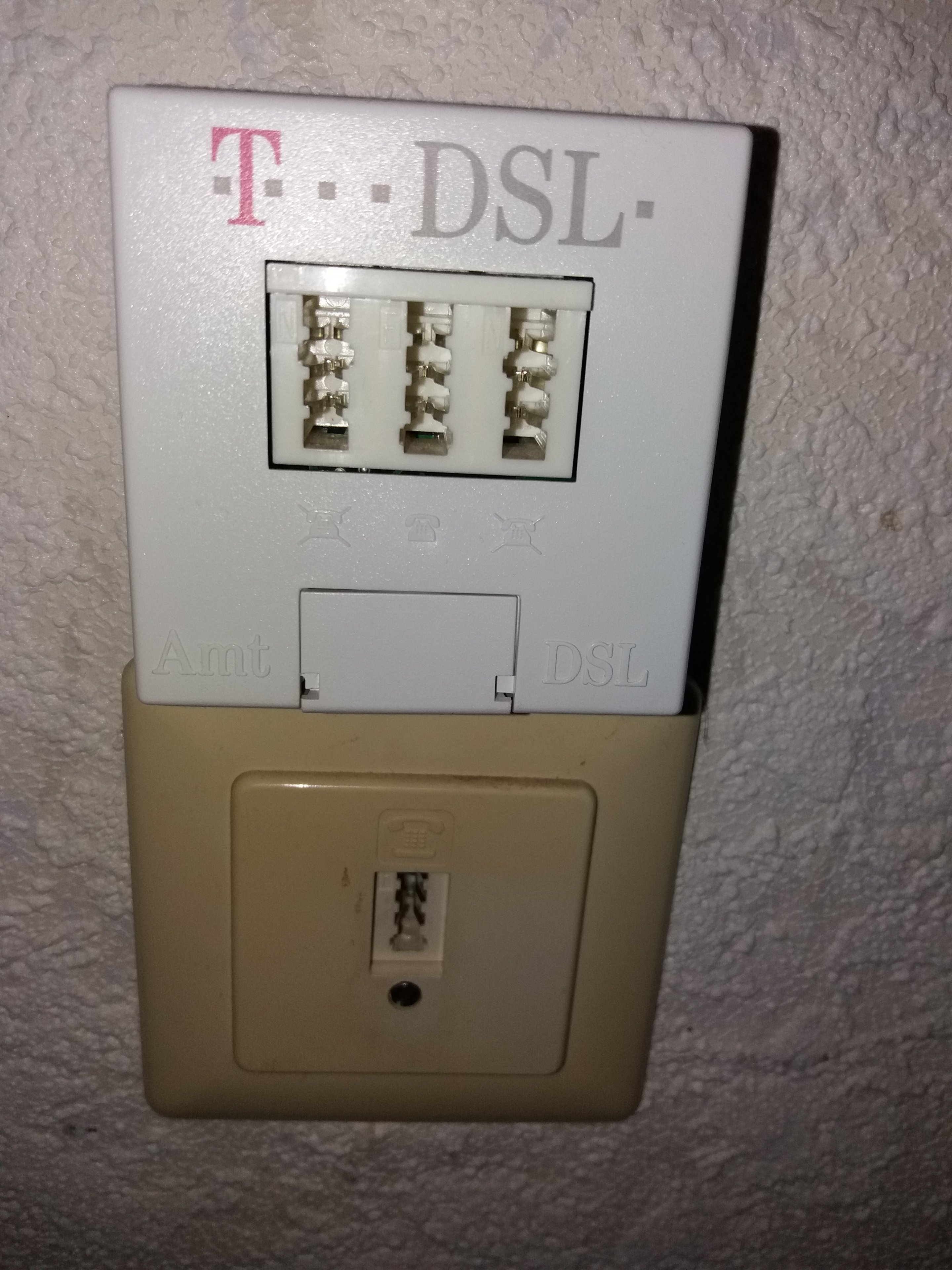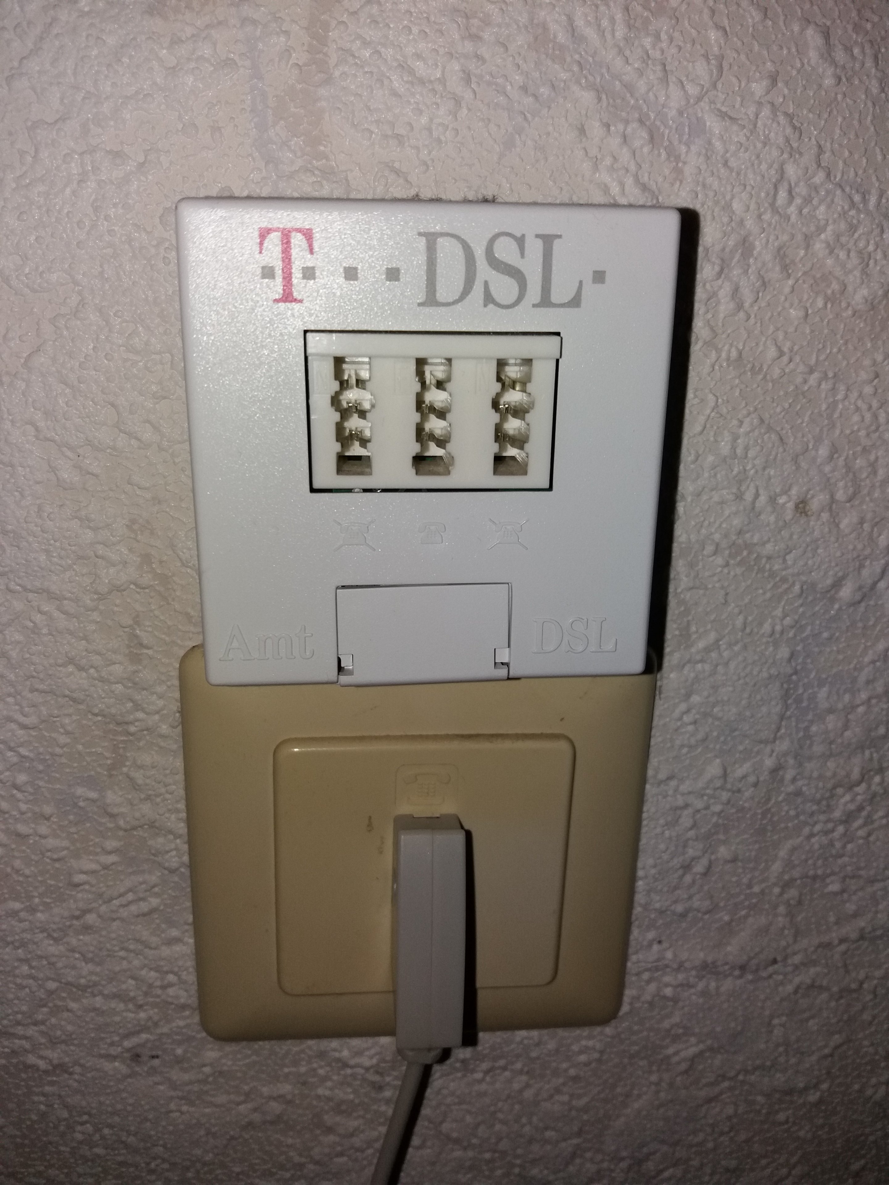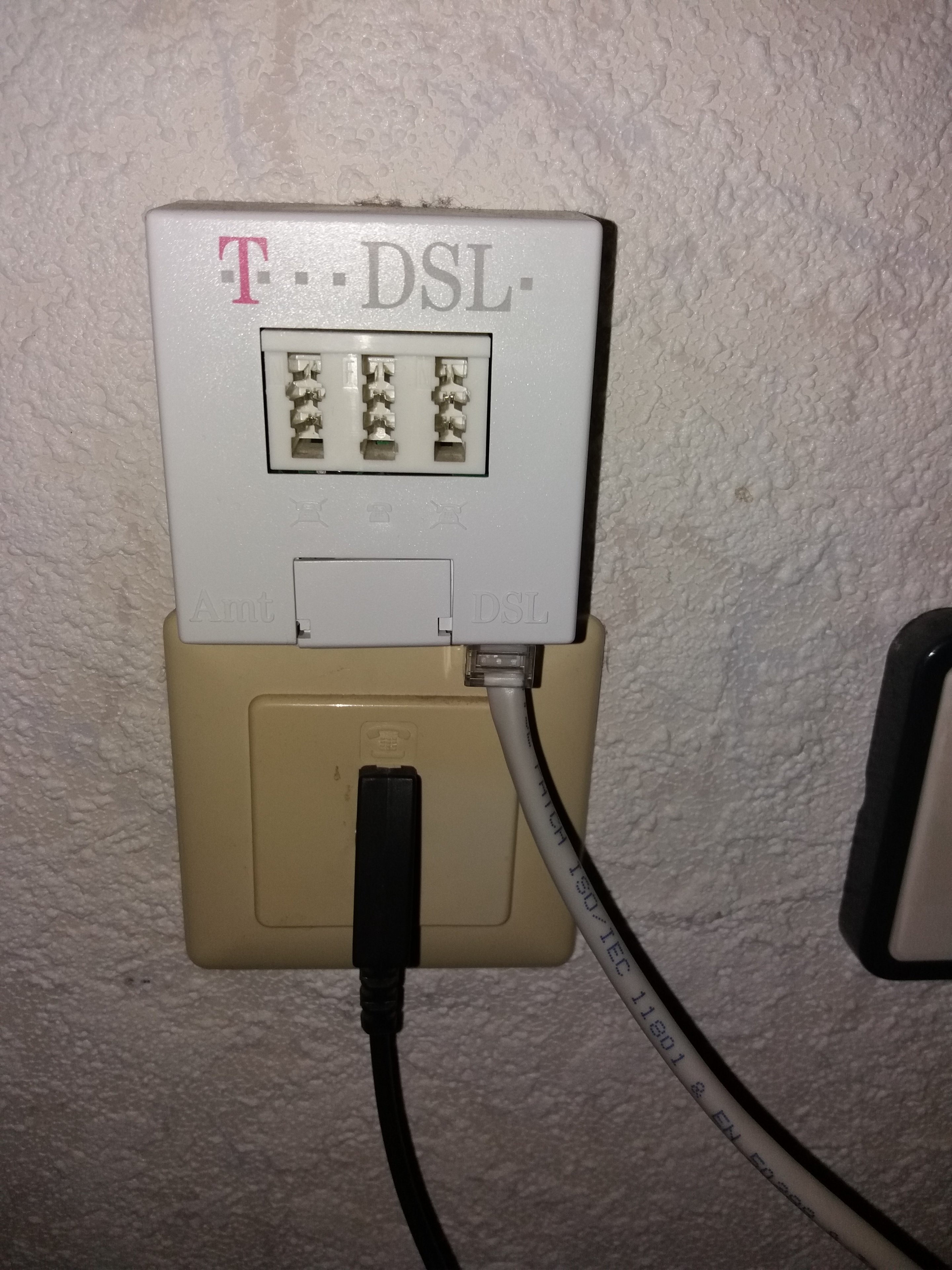 An der Wand ist eine Dose, nur mit einem Anschluss, wo das Kabel des Routers auch genau passt und wo vorher das Telefon angeschlossen war. Obendrüber sitzt der Splitter, der ja nicht mehr benötigt wird.