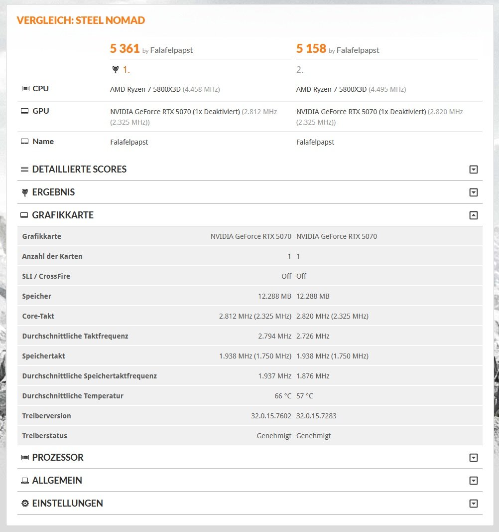 Du merkst 7-10% ?!? Respekt !!Tornavida schrieb:Ich habs gestern in CP77 gemerkt und dann mit Steel Nomad nachgeprüft bei meiner 5070ti. Beides einen ordentlichen Boost erhalten im Bereich 7-10% was mich schon erstaunt hat.
