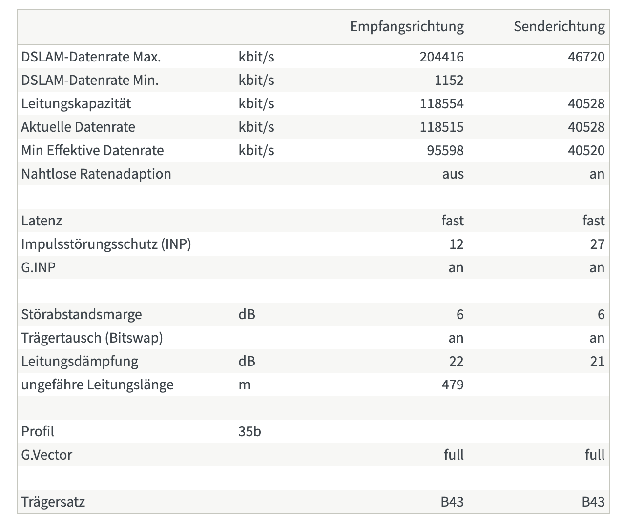 175 Gebucht, angekommen sind zu Beginn ca. 114-120mb bei ca. 417-500 Metern und sind im laufe von 10 Monaten auf 100-104mb gesunken. Die Abbrüche hatte ich leider auch mal jeden Tag und mal mit viel Glück alle 3-10 Tage. Das Ende vom Lied war dass ich diese Instabile Leitung auf VDSL 100 zurückbuchen musste. Denn 10€ mehr zu bezahlen für eine Instabile Leitung und für 104mb war doch Schwachsinnig.